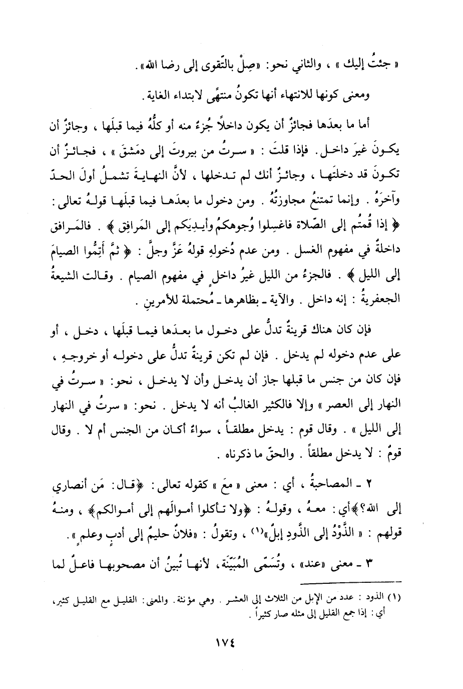 أمّا ما بعدَها فجائزٌ أن يكون داخلاً جُزءٌ منه أو كلُّهُ فيما قبلَها، وجائزٌ أن يكونَ غيرَ داخل. فإذا قلتَ "سرتُ من بيروتَ إلى دمَشقَ"، فجائزٌ أن تكون قد دخلتَها، وجائزٌ أنك لم تدخلها، لأنَّ النهايةَ تشملُ أولَ الحدّ وآخرَهُ. وإنما تمتنعُ مجاوزتُهُ. ومن دخول ما بعدَها فيما قبلَها قولهُ تعالى {إذا قُمتُم إلى الصَّلاة فاغسِلوا وُجوهكُم وأيديَكُم إلى المَرافِق} . فالمَرافق داخلةٌ في مفهوم الغسل. ومن عدم دُخولهِ قولهُ عَزَّ وجلَّ {ثمَّ أَتِمُّوا الصيامَ إلى الليل} . فالجزءُ من الليل غيرُ داخلٍ في مفهوم الصيام. وقالت الشيعةُ الجعفريةُ إنه داخل. والآية - بظاهرها - مُحتملة للأمرينِ.