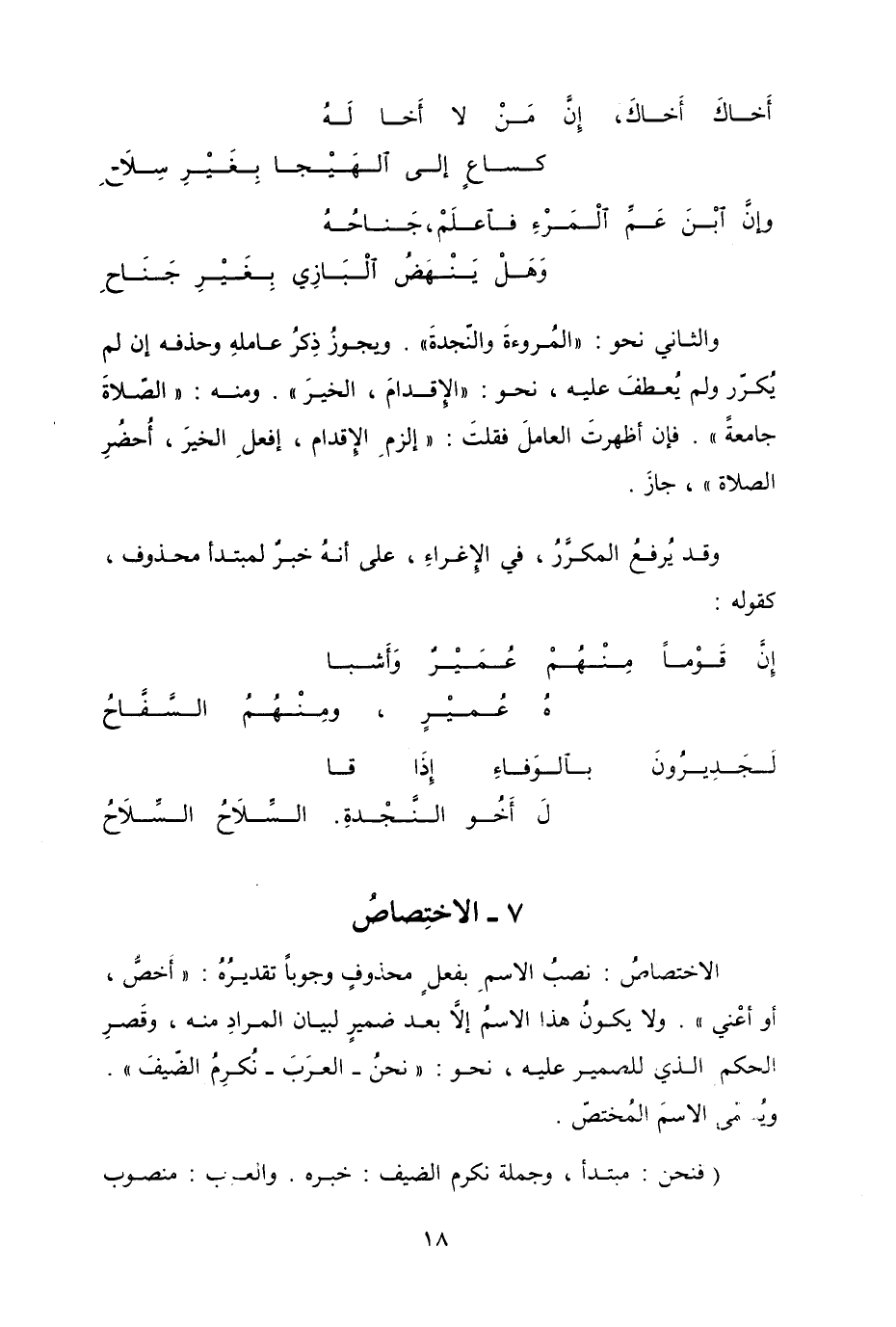 والثاني نحو "المُروءةَ والنّجدةَ". ويجوزُ ذِكرُ عاملهِ وحذفه إن لم يُكرّر ولم يُعطَفْ عليه، نحو "الإِقدامَ، الخيرَ". ومنه "الصّلاةَ جامعةً". فإن أظهرتَ العاملَ فقلتَ "اِلزمِ الإقدام، إفعَلِ الخيرَ، أُحضُرِ الصلاة"، جازَ.
