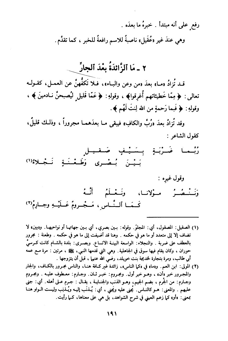 قد تُزادُ "ما" بعدَ "من وعن والباء"، فلا تَكفُّهنَّ عن العمل، كقوله تعالى {مِمّا خَطيئاتهم أُغرِقوا} ، وقولهِ {عَمّا قَليلٍ ليُصبحنَّ نادمينَ} ، وقولهِ {فَبما رَحمةٍ من الله لِنتَ لَهُم} .
