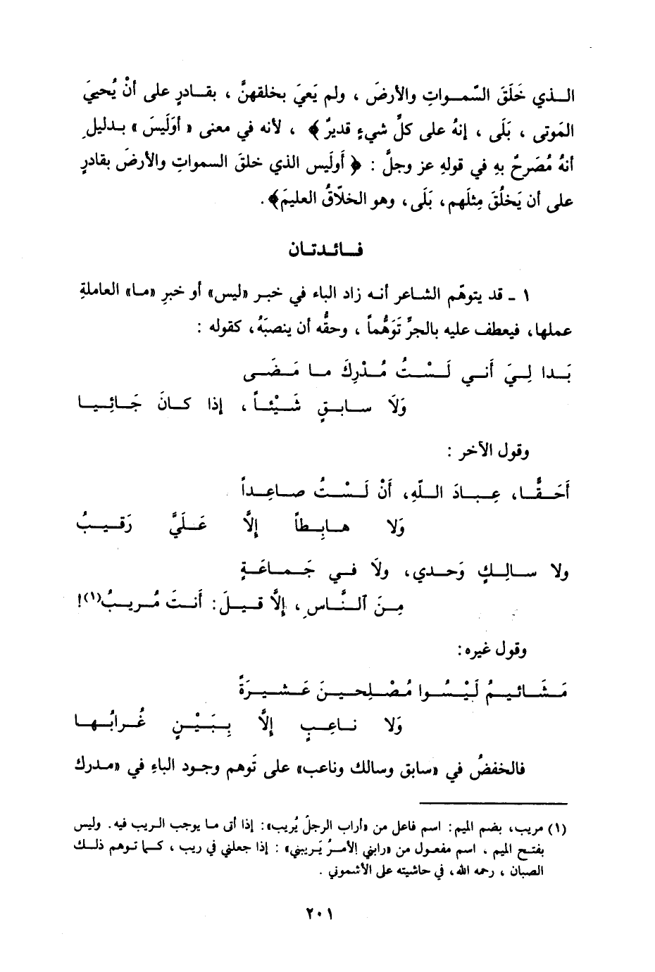 الذي خَلَقَ السّمواتِ والأرضَ، ولم يَعيَ بخلقهنَّ، بقادرٍ على أنْ يُحييَ المَوتى، بَلَى، إنهُ على كلِّ شيءٍ قديرٌ} ، لأنه في معنى "أَوَلَيسَ" بدليلِ أَنهُ مُصَرحٌ بهِ في قولهِ عز وجلّ {أَوَلَيس الذي خلقَ السمواتِ والأرضَ بقادرٍ على أن يَخلُقَ مِثلَهم، بَلَى، وهو الخلاّقُ العليمَ} [يس: 81] .