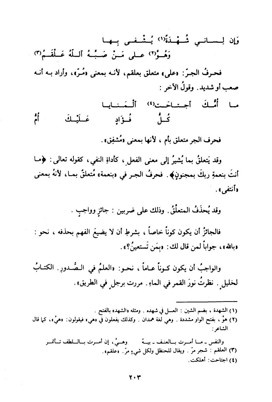 وقد يَتعلقُ بما يُشيرُ إلى معنى الفعلِ، كأداةِ النفي، كقوله تعالى {ما أَنتَ بنعمةِ ربكَ بمجنونٍ} . فحرفُ الجر في "بنعمة" مُتعلقٌ بما، لأنهُ بمعنى "انتفى".