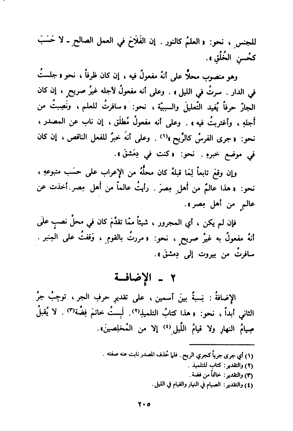 الإضافةُ نِسبةٌ بينَ اسمين، على تقديرِ حرفِ الجر، توجِبُ جرَّ الثاني أبداً، نحو "هذا كتابُ التلميذِ. لَبِستُ خاتمَ فِضَّة. لا يُقبلُ صِيامُ النهارِ ولا قيامُ اللَّيلِ إلا من المُخلِصينَ".