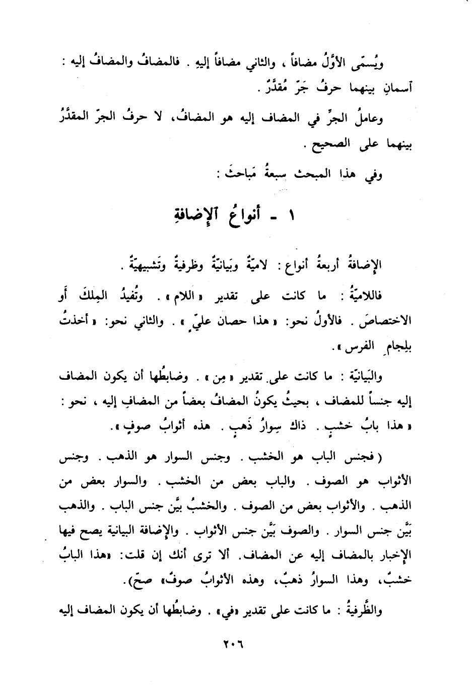 (فجنس الباب هو الخشب., وجنس السوار هو الذهب. وجنس الأثواب هو الصوف. والباب بعض من الخشب. والسوار بعض من الذهب. والأثواب بعض من الصوف. والخشبُ بيَّن جنس الباب. والذهب بَيَّن جنسِ السوار. والصوف بَيَّن جنس الأثواب. والإضافة البيانية يصح فيها الإخبار بالمضاف إليه عن المضاف. ألا ترى أنك إن قلت "هذا البابُ خشبٌ، وهذا السوارُ ذهبٌ، وهذه الأثوابُ صوفٌ" صحّ) .
