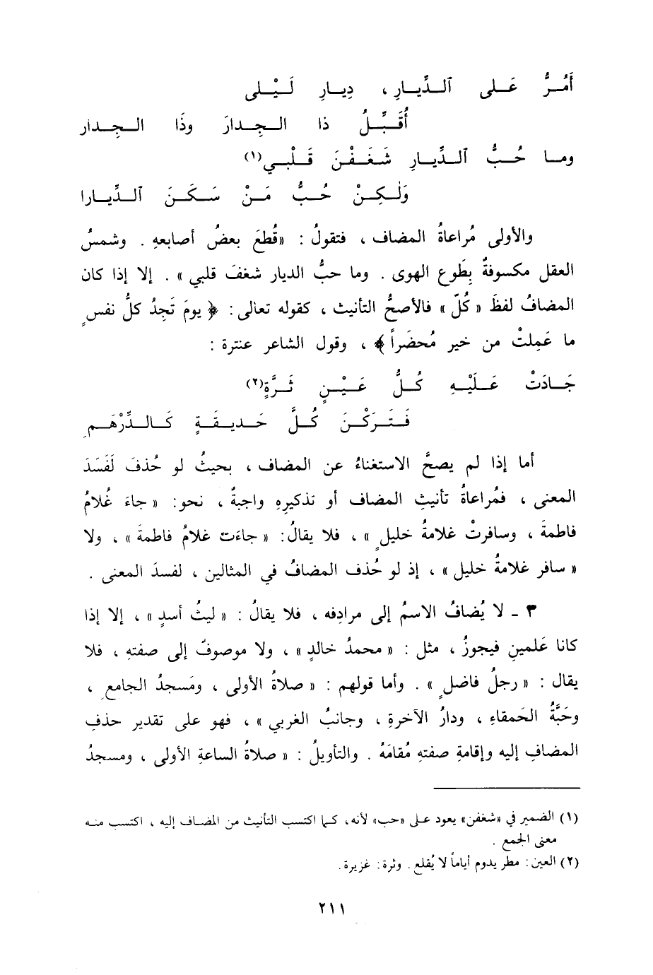 3- لا يَضافُ الاسمُ إلى مرادِفه، فلا يقالُ "ليثُ أسدِ"، إِلا إِذا كانا عَلمينِ فيجوزُ، مثل "محمدُ خالدٍ"، ولا موصوفٌ إلى صفتهِ، فلا يقال "رجلُ فاضلٍ". وأما قولهم "صلاةُ الأولى، ومَسجدُ الجامعِ، وحَبَّةُ الحَمقاءِ، ودارُ الآخرةِ، وجانبُ الغربي، فهو على تقدير حذفِ المضافِ إليه وإقامةِ صفتهِ مُقامَهُ. والتأويلُ "صلاةُ الساعةِ الأولى، ومسجدُ