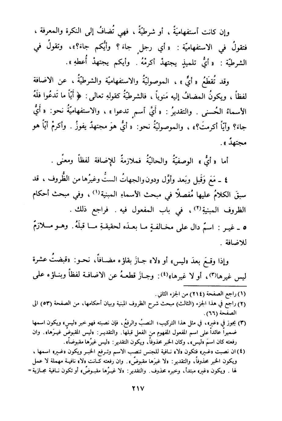 أما "أيُّ" الوصفيّةُ والحاليّةُ فملازمةٌ للاضافة لفظاً ومعنًى.