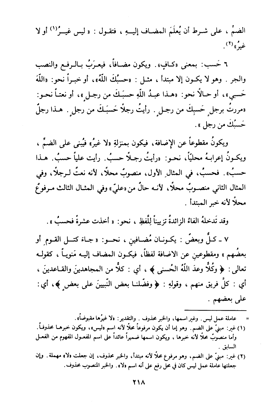 6- حَسب بمعنى "كافٍ". ويكون مضافاً، فيعرَبُ بالرفع والنصب والجر. وهو لا يكون إلا مبتدأ، مثل "حسبُكَ اللهُ"، أو خبراً نحو "اللهَ حَسبي"، أو حالاً نحو "هذا عبدُ اللهِ حسبَكَ من رجلٍ"، أو نعتاً نحو "مررتُ برجلٍ حَسبِكَ من رجلٍ. رأيتُ رجلاً حَسبَكَ من رجلٍ. هذا رجلٌ حَسبُكَ من رجل".