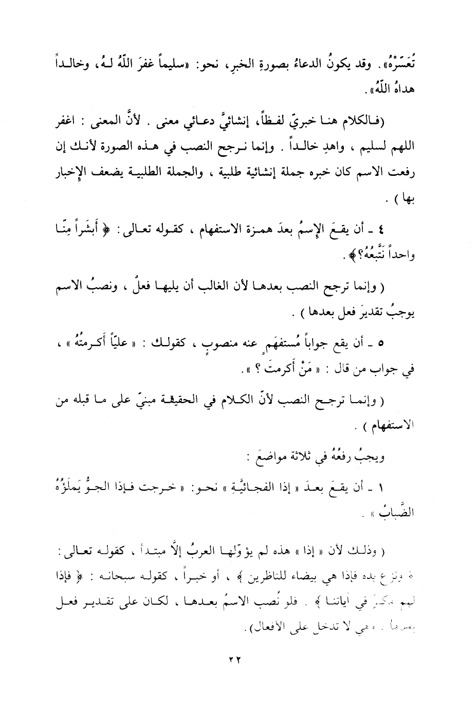 (فالكلام هنا خبري لفظاً، انشائيَّ دعائي معنى. لأنّ المعنى اغفر اللهم لسليم، واهدِ خالداً. وانما ترجح النصب في هذه الصور لأنك ان رفعت الاسم كان خبره جملة انشائية طلبية، والجملة الطلبية يضعف الإخبار بها) .