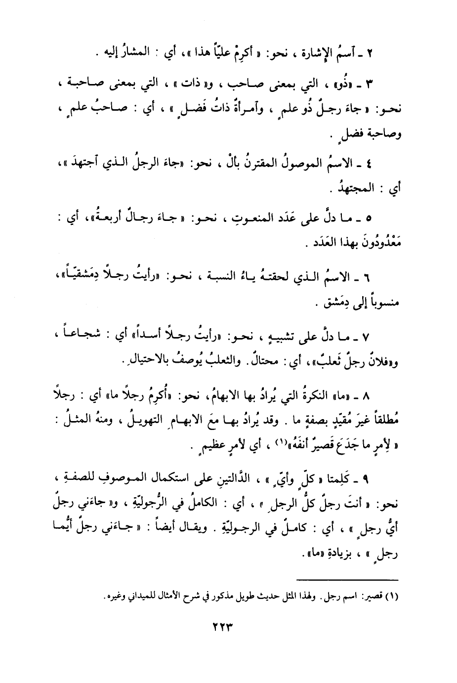 8- "ما" النكرةُ التي يُرادُ بها الابهامُ، نحو "أُكرِمُ رجلاً ما" أي رجلاً مُطلقاً غيرَ مُقيّدٍ بصفةٍ ما. وقد يُرادُ بها معَ الابهامِ التهويلُ، ومنهُ المثلُ "لأمرٍ ماجَدَعَ قَصيرٌ أنفَهُ"، أي لأمرٍ عظيمٍ.