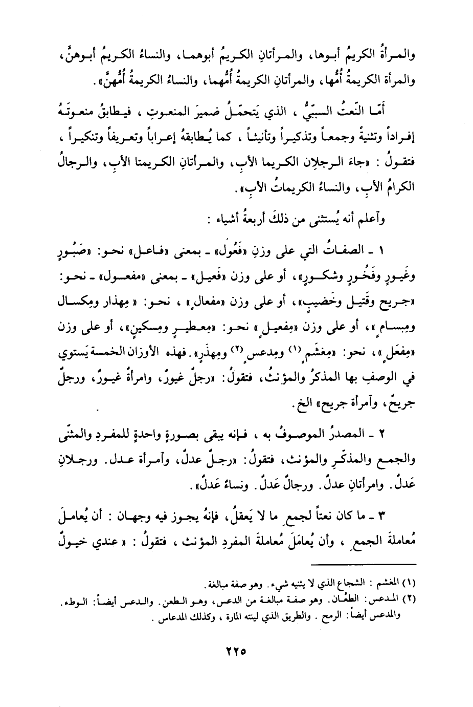 1- الصفاتُ التي على وزنِ "فَعُول" - بمعنى "فاعل" نحو "صَبُورٍ وغَيورٍ وفَخُورٍ وشكُورٍ"، أو على وزن "فَعِيل" - بمعنى "مفعول" - نحو "جريح وقَتيل وخَضيبٍ"، أو على وزن "مفعالٍ"، نحو "مِهذار ومِكسال ومِبسامٍ"، أو على وزن "مِفعيلٍ" نحو "مِعطيرٍ ومِسكينٍ"، أو على وزن "مِفعَلٍ"، نحو "مِغشَمٍ ومِدعسٍ ومِهذَرٍ". فهذه الأوزان الخمسةُ يَستوي في الوصفِ بها المذكرُ والمؤنثُ، فتقولُ "رجلٌ غيورٌ، وامرأةٌ غيورٌ، ورجلٌ جريحٌ، وارمأة جريح" الخ.
