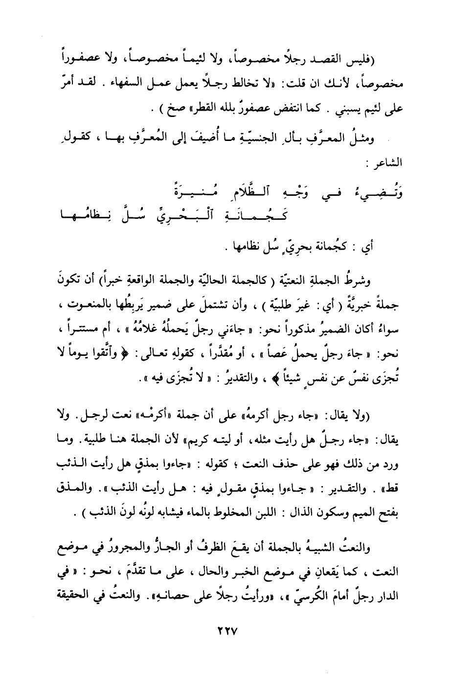 (فليس القصد رجلاً مخصوصاً، ولا لئيماً مخصوصاً، ولا عصفوراً، مخصوصاً، لأنك ان قلت "لا تخالط رجلاً يعمل عمل السفهاء. لقد أمرّ على لئيم يسبني. كما انتفض عصفورٌ بلله القطر" صح) .