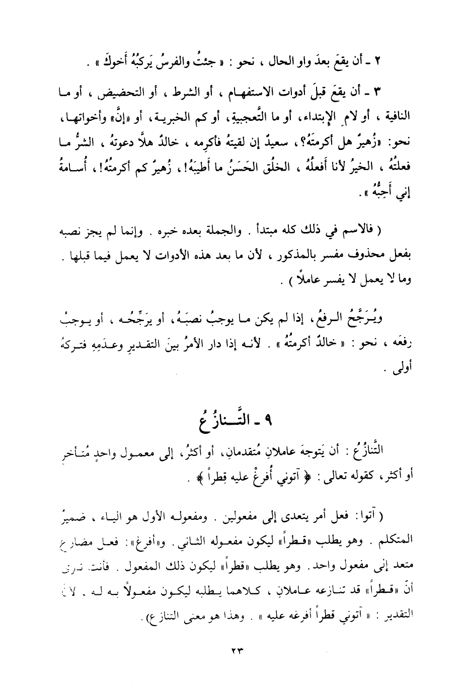 (آتوا فعل أمر يتعدى الى مفعولين. ومفعوله الأول هو الياء، ضميرُ المتكلم. وهو يطلب "قطراً" ليكون مفعوله الثاني. و "أفرغ" فعل مضارع متعد الى مفعول واحد. وهو يطلب "قطراً" ليكون ذلك المفعول. فأنت ترى أنّ "قطراً" قد تنازعه عاملانِ، كلاهما يطلبه ليكون مفعولاً به له، لأنّ التقدير {آتوني قطراً أفرغه عليه} . وهذا هو معنى التنازع) .