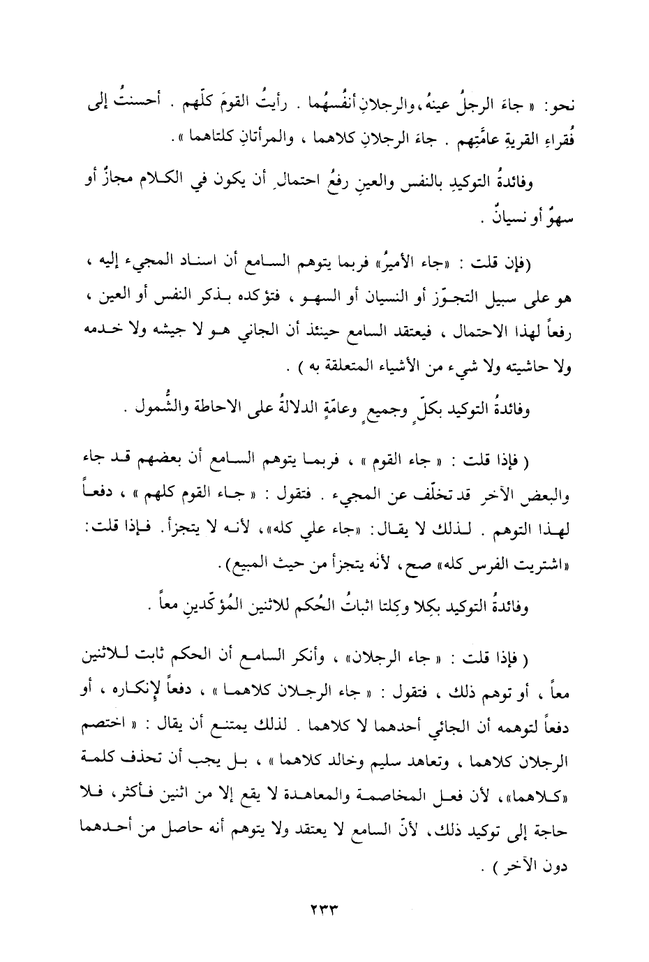 (فان قلت "جاء الأميرُ" فربما يتوهم السامع أن اسناد المجيء إليه، هو على سبيل التجوّز أو النسيان أو السهو، فتؤكده بذكر النفس أو العين، رفعاً لهذا الاحتمال، فيعتقد السامع حينئذ أن الجائي هو لا جيشه ولا خدمه ولا حاشيته ولا شيء من الأشياء المتعلقة به) .
