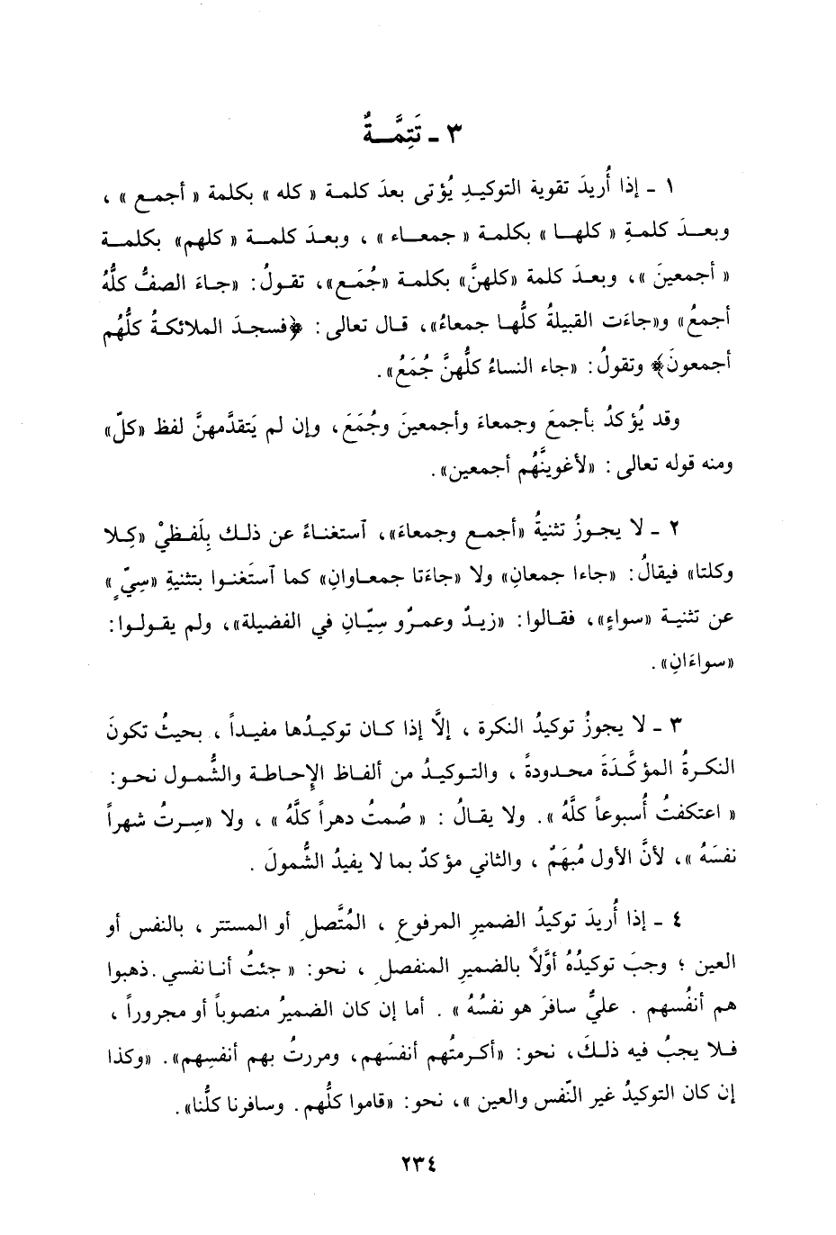 1- إذا أُريدَ تقوية التوكيدِ يُؤتى بعدَ كلمة "كله" بكلمة "أجمع"، وبعدَ كلمةِ "كلها" بكلمة "جمعاء"، وبعدَ كلمة "كلهم" بكلمة "أجمعينَ"، وبعدَ كلمة "كلهنَّ" بكلمة "جُمَع"، تقولُ "جاءَ الصفُّ كلُّهُ أجمعُ" و"جاءَت القبيلةُ كلُّها جمعاءُ"، قال تعالى {فسجدَ الملائكةُ كلُّهُم أجمعونَ} وتقولُ "جاءَ النساءُ كلُّهنَّ جُمَعُ".