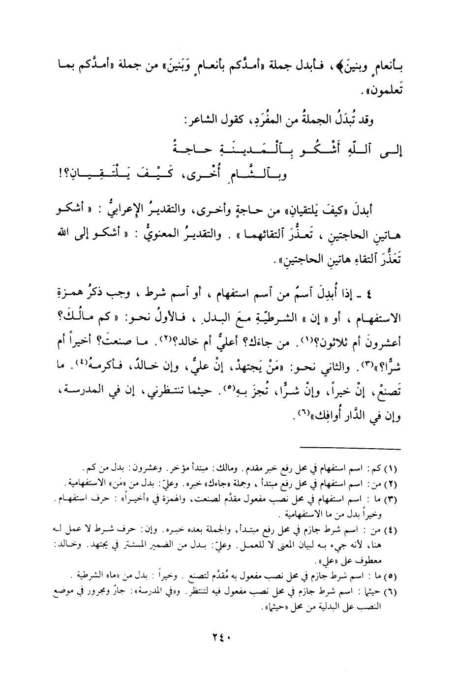 4- إذا أُبدِلَ اسمٌ من اسم استفهام، أو اسم شرط، وجب ذكرُ همزةِ الاستفهام، أو "إن" الشرطيّةِ معَ البدلِ، فالأولُ نحو "كم مالُكَ؟ أعشرونَ أم ثلاثون؟. من جاءَك؟ أعليٌّ أم خالد؟. ما صنعتَ؟ أخيراً أم شرًّا؟ ". والثاني نحو "مَنْ يَجتهدْ، إنْ عليٌّ، وإن خالدٌ، فأكرمهُ. ما تَصنعْ، إنْ خيراً، وإنْ شرًّا، تُجزَ بهِ. حيثما تنتظرني، إنْ في المدرسة، وإن في الدَّار أُوافِك".