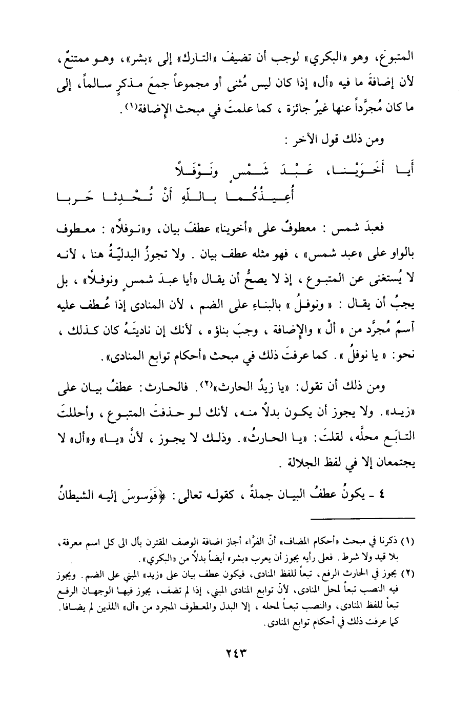 فعبدَ شمس معطوفٌ على "أخوينا" عطفَ بيان، و"نوفلاً" معطوف بالواو على "عبد شمس"، فهو مثله عطف بيان. ولا تجوزُ البدليَّةُ هنا، لأنه لا يُستغنى عن المتبوع، إذ لا يصحُّ أن يقال "أيا عبدَ شمسٍ ونوفلاً"، بل يجبُ أن يقال "ونوفلُ" بالنباءِ على الضم، لأن المنادى إذا عُطف عليه اسمٌ مُجرَّد من "ألْ" والإضافة، وجبَ بناؤه، لأنك إن ناديتَهُ كان كذلك، نحو "يا نوفلُ". كما عرفتَ ذلك في مبحث "أحكام توابع المنادى".