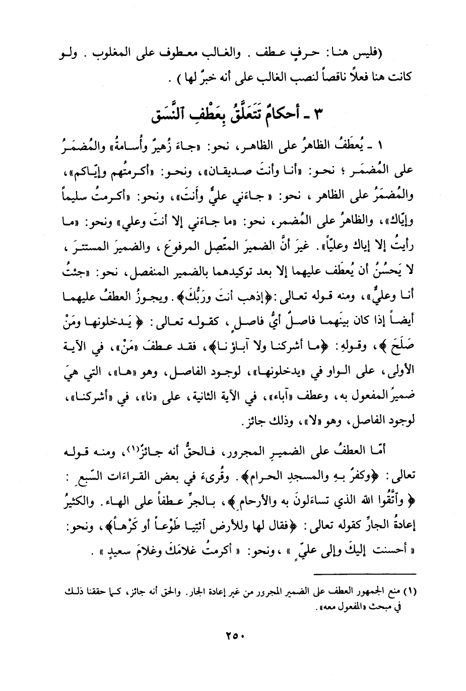 أمّا العطفُ على الضميرِ المجرور، فالحقُّ أنه جائزٌ، ومنه قوله تعالى {وكفرٌ بهِ والمسجدِ الحرام} . وقُريءَ في بعض القراءَات السّبعِ {واتَّقُوا الله لاذي تساءَلونَ به والأرحامِ} ، بالجرِّ عطفاً على الهاء. والكثيرُ إعادةُ الجارِّ كقوله تعالى {فقال لها وللأرض ائتِيا طَوْعاً وكَرْهاً} ، ونحو "أحسنت إليكَ وإلى عليٍّ"، ونحو "أكرمتُ غلامَكَ وغلامَ سعيدٍ".