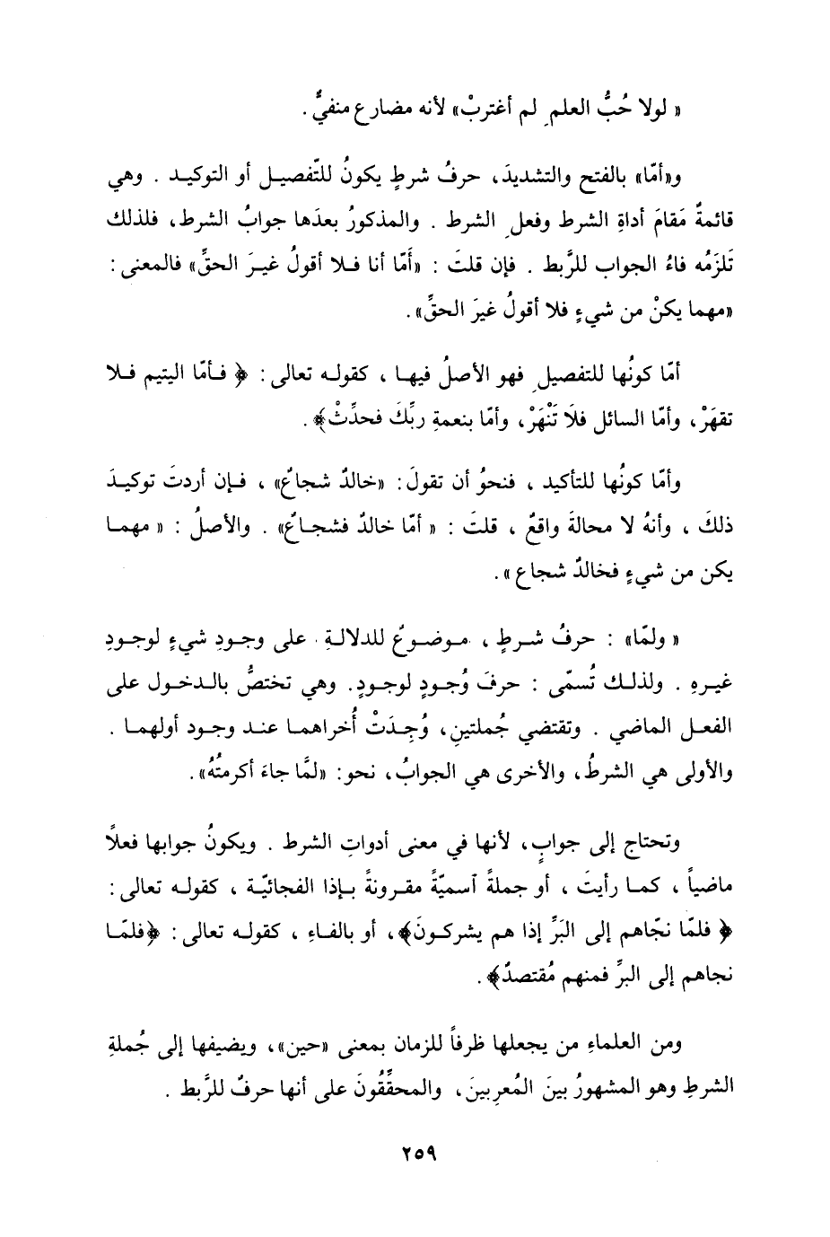 ومن العلماءِ من يجعلها ظرفاً للزمان بمعنى "حين"، ويضيفها إلى جُملةِ الشرطِ وهو المشهورُ بينَ المُغرِبينَ، والمحقِّقُونَ على أنها حرفٌ للرَّبط.