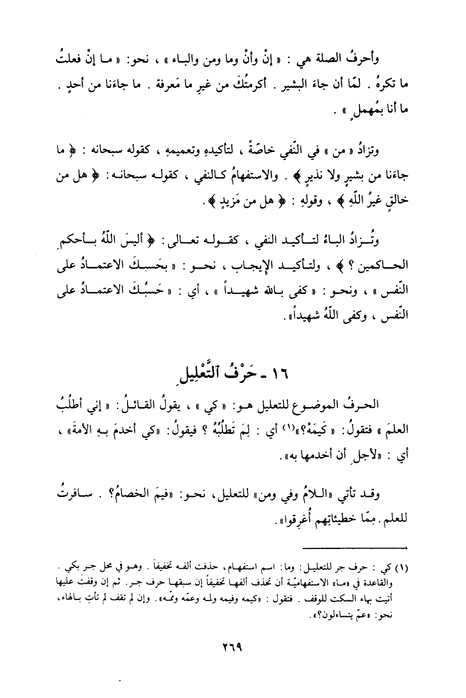 الحرفُ الموضوع للتعليل هو "كي"، يقولُ القائلُ "إني أطلُبُ العلمَ" فتقولُ "كيَمَهْ؟ " أي لِمَ تَطلبُهُ؟ فيقولُ "كي أخدمَ بهِ الأمةَ"، أي "لأجلِ أن أخدمها به".