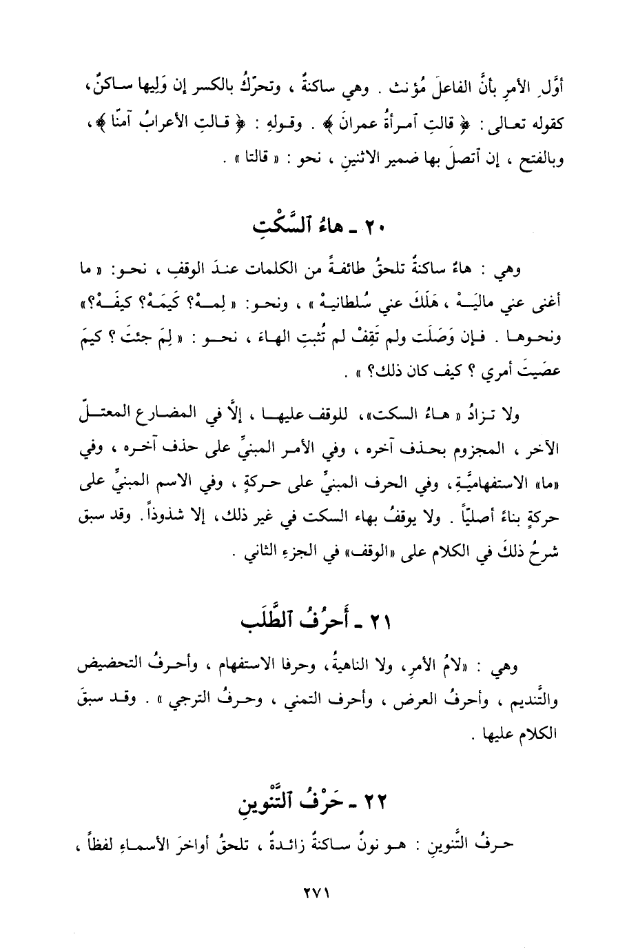 ولا تزادُ "هاءُ السكت"، للوقف عليها، إلا في المضارع المعتلّ الآخر، المجزومِ بحذف آخره، وفي الأمر المبنيِّ على حذف آخره، وفي "ما" الاستفهاميَّةِ، وفي الحرف المبنيِّ على حركةٍ، وفي الاسم المبنيِّ على حركةِ بناءً أصليّاً. ولا يوقفُ بهاء السكت في غير ذلك، إلا شذوذاً. وقد سبق شرحُ ذلكَ في الكلام على "الوقف" في الجزءِ الثاني.