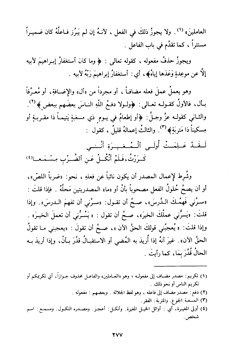 ويجوزُ حذفُ مفعوله، كقوله تعالى {وما كان استغفارُ إبراهيمَ لأبيه إلا عن موعِدةٍ وَعدَها إياهُ} ، أَي استغفار إبراهيمَ رَبّهُ لأبيه.