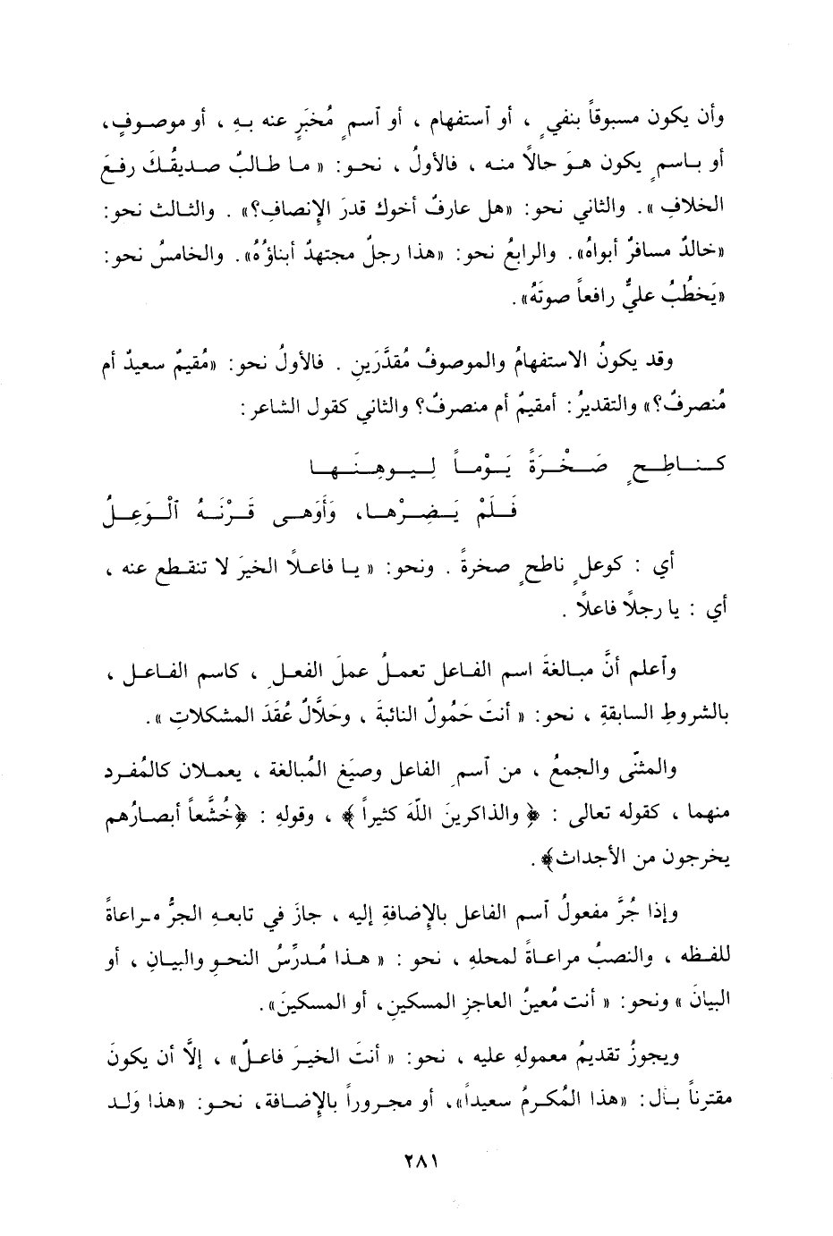 وأن يكون مسبوقاً بنفيٍ، أو استفهام، أو اسمٍ مُخبَرٍ عنه بهِ، أو موصوفٍ، أو باسمٍ يكون هوَ حالاً منه، فالأولُ، نحو "ما طالبٌ صديقُكَ رفعَ الخلافِ". والثاني نحو "هلْ عارفٌ أخوك قدرَ الإنصافِ؟ ". والثالث نحو "خالدٌ مسافرٌ أبواهُ". والرابعُ نحو "هذا رجلٌ مجتهدٌ أبناؤُهُ". والخامسُ نحو "يَخطُبُ عليٌّ رافعاً صوتَهُ".