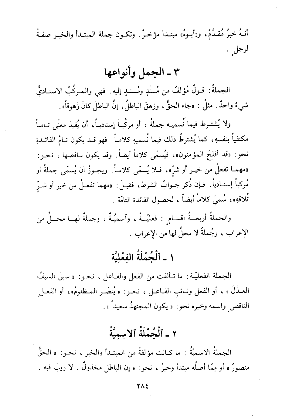 والجملةُ أَربعةُ أَقسامٍ فعليّةٌ، واسميَّةٌ، وجملةٌ لها محلٌّ من الإعراب، وجُملةٌ لا محلَّ لها من الإعراب.