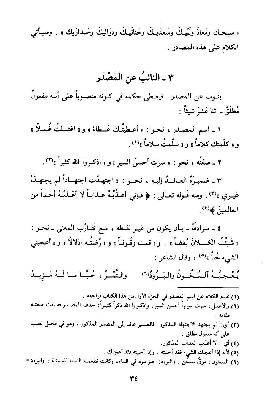 سبحان ومَعاذَ ولَبيّكَ وسَعدَيكَ وحنَانَيكَ ودوَاليكَ وحَذارَيك". وسيأتي الكلام على هذه المصادر.