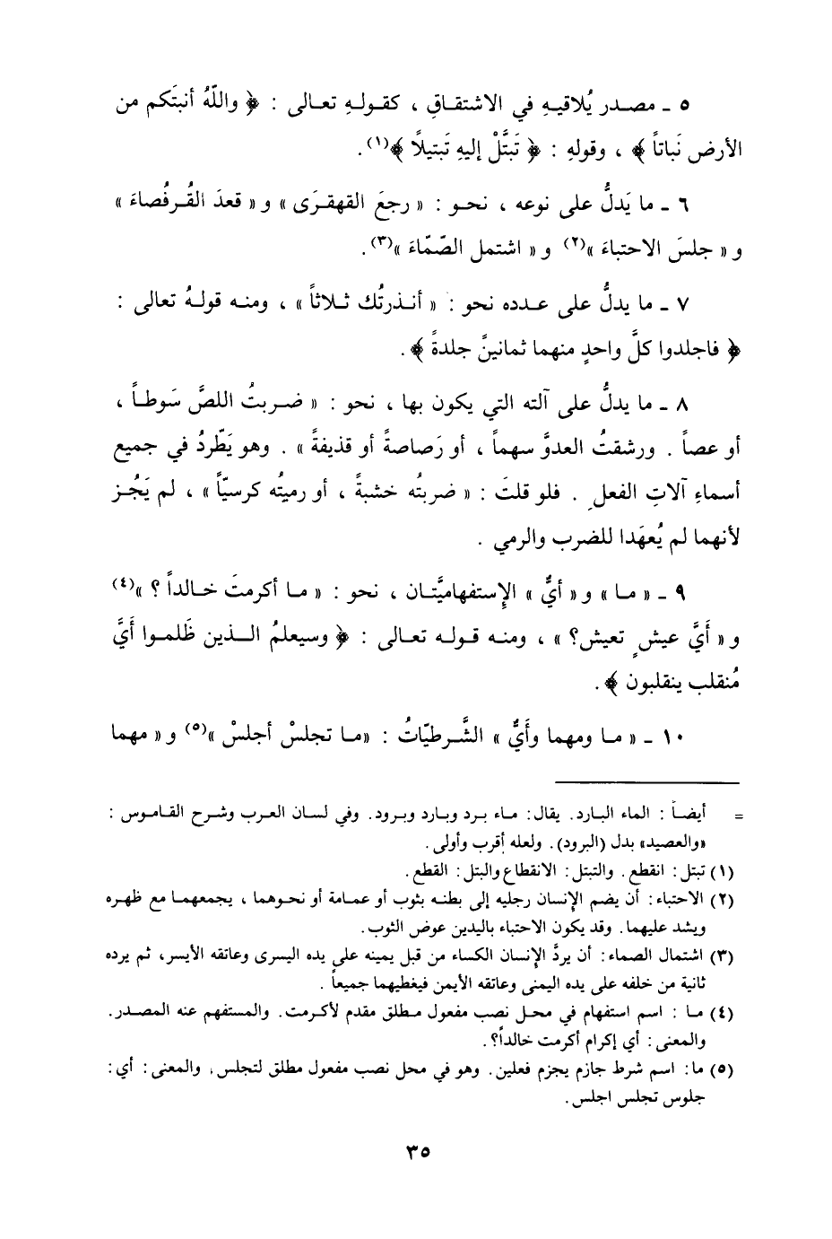 5- مصدر يُلاقيهِ في الاشتقاقِ، كقولهِ تعالى {واللهُ أنبتَكم من الأرض نبَاتاً} ، وقولهِ {تَبتَّلْ إليهِ تَبتيلاً} .