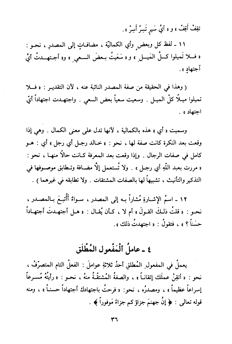 11- لفظ كل وبعضٍ وأي الكماليّة، مضافاتٍ إلى المصدرِ، نحو {فلا تَميلوا كلَّ المَيلِ} و"سَعَيتُ بعضَ السعيِ" "واجتهتدتُ أيَّ اجتهادٍ".