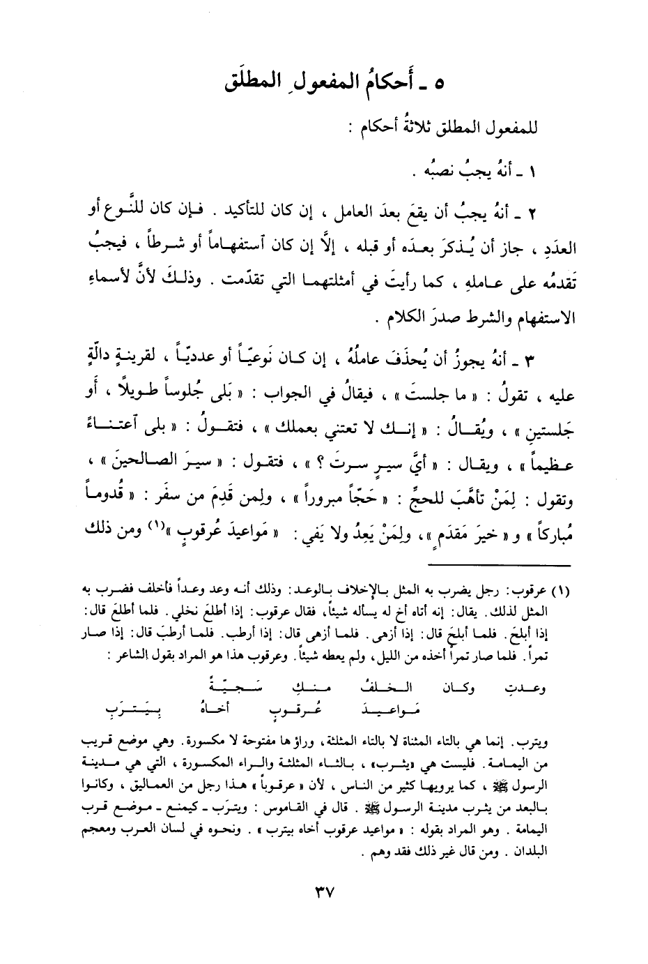 3- أنهُ يجوزُ أن يُحذَفَ عاملُهُ، إن كان نَوعيّاً أو عدديّاً، لقرينةٍ دالّةٍ عليه، تقولُ "ما جلستَ"، فيقالُ في الجواب "بَلى جُلوساً طويلاً، أَو جَلستينِ"، ويُقالُ "إنك لا تعتني بعملك"، فتقولُ "بلى اعتناءً عظيماً"، ويقال "أيَّ سيرٍ سرتَ؟ "، فتقول "سيرَ الصالحينَ"، وتقول لِمنْ تأهَّبَ للحجَّ "حَجّاً مبروراً"، ولِمن قَدِمَ من سفَر "قُدوماً مُباركاً" و"خيرَ مَقدَمٍ"، ولِمن يُعِدُ ولا يَفي "مَواعيدَ عُرقوبٍ" من ذلك