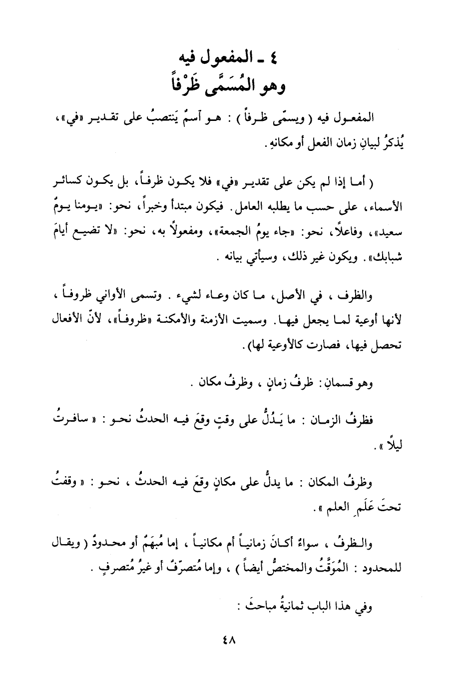 (أما اذا لم يكن على تقدير "في" فلا يكون ظرفاً، بل يكون كسائر الاسماء، على حسب ما يطلبه العامل. فيكون مبتدأ وخبراً، نحو "يومنا يومٌ سعيد"، وفاعلاً، نحو "جاء يومُ الجمعة"، ومفعولاً به، نحو "لا تضيع أيامَ شبابك". ويكون غير ذلك، وسيأتي بيانه.