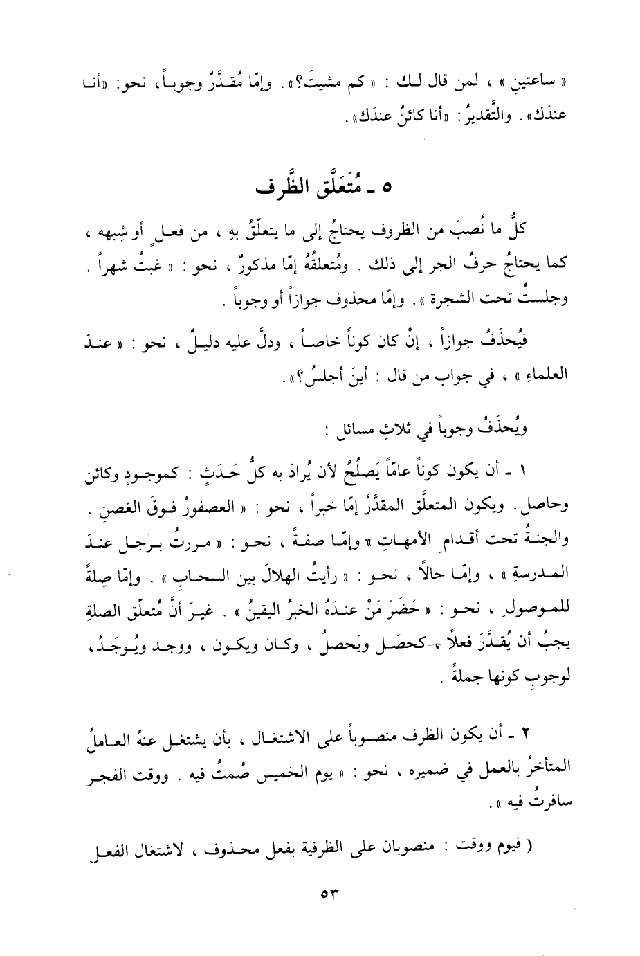 "ساعتينِ"، لمن قال لك "كم مشيتَ؟ ". وإمّا مُقدَّرٌ وجوباً، نحو "أنا عندَك". والتَّقديرُ "أنا كائنٌ عندَك".