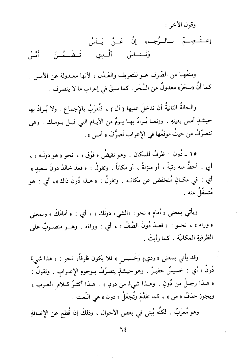 15- دُون ظرفٌ للمكان. وهو نقيضُ "فوْق"، نحو "هو دونَه"، أي أحُّ منه رتبةً، أو منزلةً، أو مكاناً. وتقولُ "قعدَ حالدٌ دونَ سعيدٍ" أي في مكانٍ مُنخفض عن مكانه. وتقولُ "هذا دُونَ ذاك"، أي هو مُتسفّلٌ عنه.