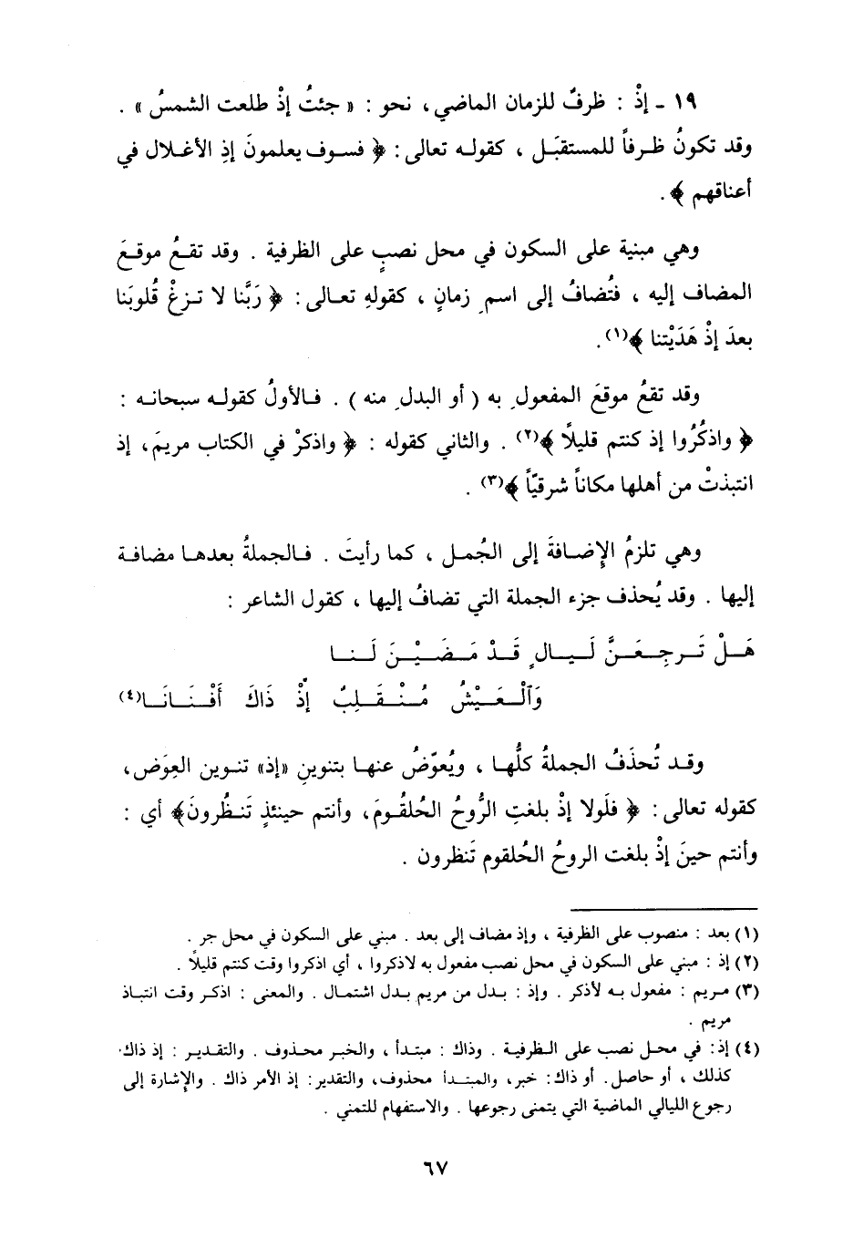 19- إذْ ظرفٌ للزمانِ الماضي، نحو "جئتُ إذْ طلعت الشمسُ". وقد تكونُ ظرفاً للمستقبَل، كقوله تعالى {فسوف يعلمونَ إذِ الأغلال في اعناقهم} .