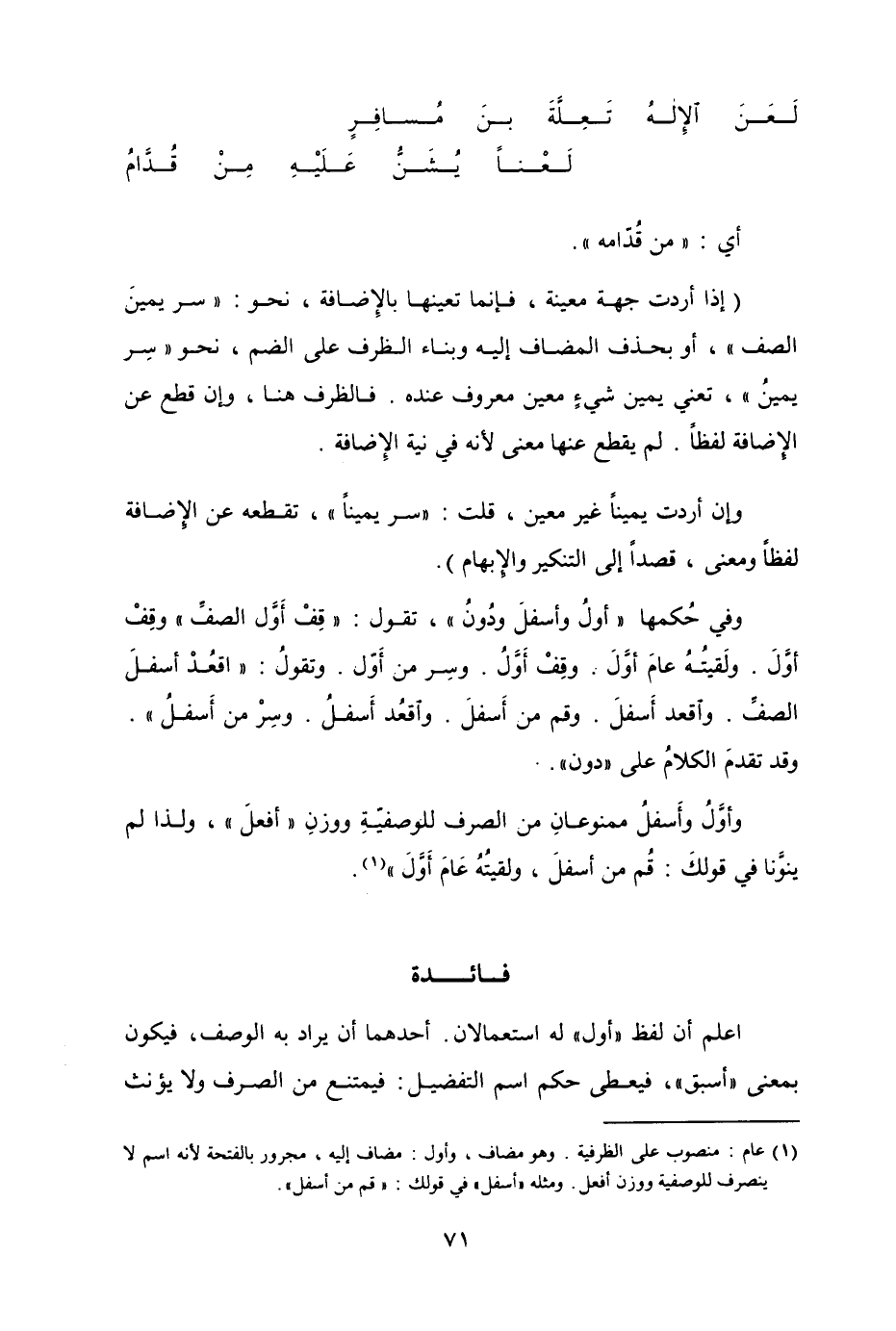 وفي حُكمها "أولُ وأسفلَ ودُونُ"، تقول "قِفْ أوَّل الصفِّ" وقِفْ أوَّلَ. وَلقيتُهُ عامَ أوَّلَ. وقِفْ أَوَّلُ. وسِر من أَوّل. وتقولُ "اقعُدْ أَسفلَ الصفِّ. واقعد أَسفلَ. وقم من أَسفلَ. واقعُد أَسفلُ. وسِرْ من أَسفلُ". وقد تقدمَ الكلامُ على "دون".