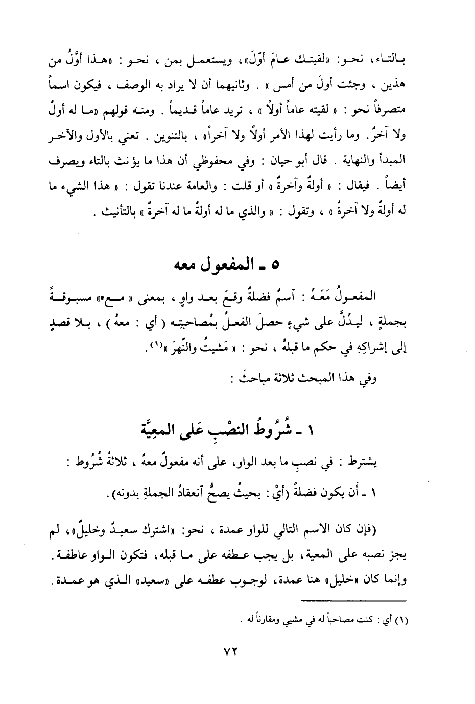 (فان كان الاسم التالي للواو عمدة، نحو "اشترك سعيدٌ وخليلٌ"، لم يجز نصبه على المعية، بل يجب عظفه على ما قبله، فتكون الواو عاطفة. وإنما كان "خليل" هنا عمدة، لوجوب عطفه على "سعيد" الذي هو عمدة.