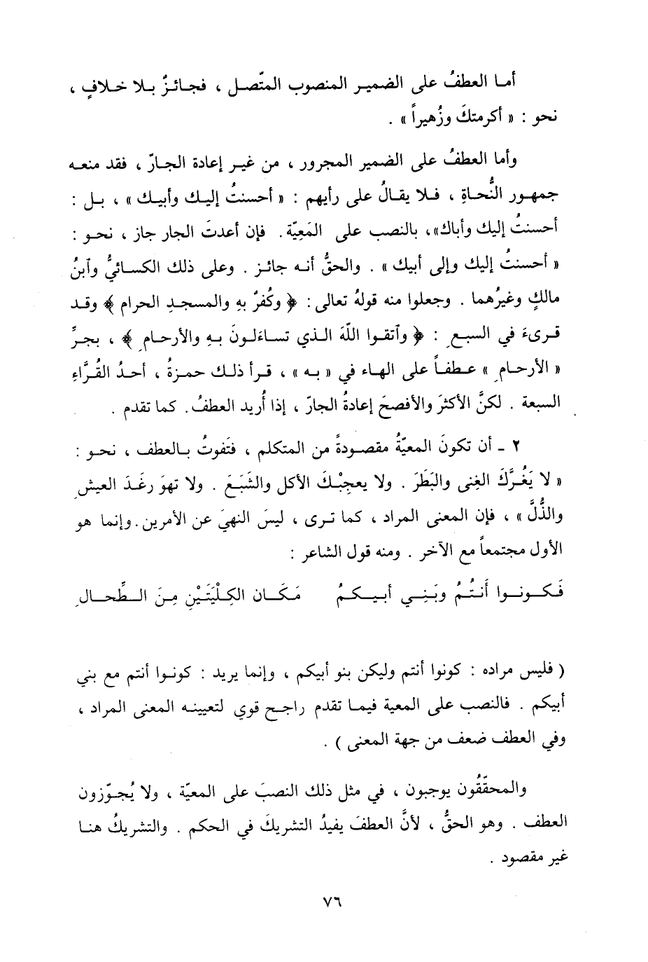 وأما العطفُ على الضمير المجرور، من غير إعادة الجارّ، فقد منعه جمهور النُّحاةِ، فلا يقالُ على رأيهم "أحسنتُ إليك وأبيك"، بل أحسنتُ إليك وأباكَ"، بالنصب على المعيّة. فإن أعدتَ الجار جازَ، نحو "أحسنتُ إليك وإلى أبيك". والحقُّ أنه جائز. وعلى ذلك الكسائيُّ وابنُ مالكٍ وغيرُهما. وجعلوا منه قولهُ تعالى {وكُفرٌ بهِ والمسجدِ الحرام} وقد قرئَ في السبعِ {واتقوا اللهَ الذي تساءَلونَ بهِ والأرحامِ} ، بجرّ "الأرحامِ" عطفاً على الهاء في "به"، قرأ ذلك حمزةُ، أحدُ القُرَّاءِ السبعة. لكنَّ الأكثرَ والأفصحَ إعادةُ الجارَ، إذا أُريد العطفُ. كما تقدّم.