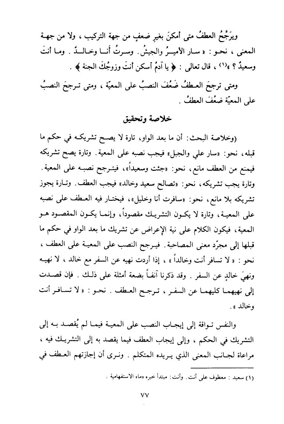 (وخلاصة البحث أن ما بعد الواو، تارة لا يصح تشريكه في حكم ما قبله، نحو "سار علي والجبل" فيجب نصبه على المعية. وتارة يصح تشريكه فيمنع من العطف مانع، نحو "جئت وسعيداً"، فيترجح نصبه على المعية. وتارة يجب تشريكه، نحو "تصالح سعيد وخالد" فيجب العطف. وتارة يجوز تشريكه بلا مانع، نحو "سافرت أنا وخليل"، فيختار فيه العطف على نصبه على المعية، وتارة لا يكون التشريك مقصوداً، وإنما يكون المقصود هو المعية، فيكون الكلام على نية الإعراض عن تشريك ما بعد الواو في حكم ما قبلها الى مجرّد معنى المصاحبة. فيرجح النصب على المعية على العطف، نحو "لا تسافر أنت وخالدً"، إذا أردت نهيه عن السفر مع خالد، لا نهيه ونهيَ خالدٍ عن السفر. وقد ذكرنا آنفاً بضعة أمثلة على ذلك. فان قصدت إلى نهيهما كليهما عن السفر، ترجح العطف. نحو "لا تسافر أنت وخالد".