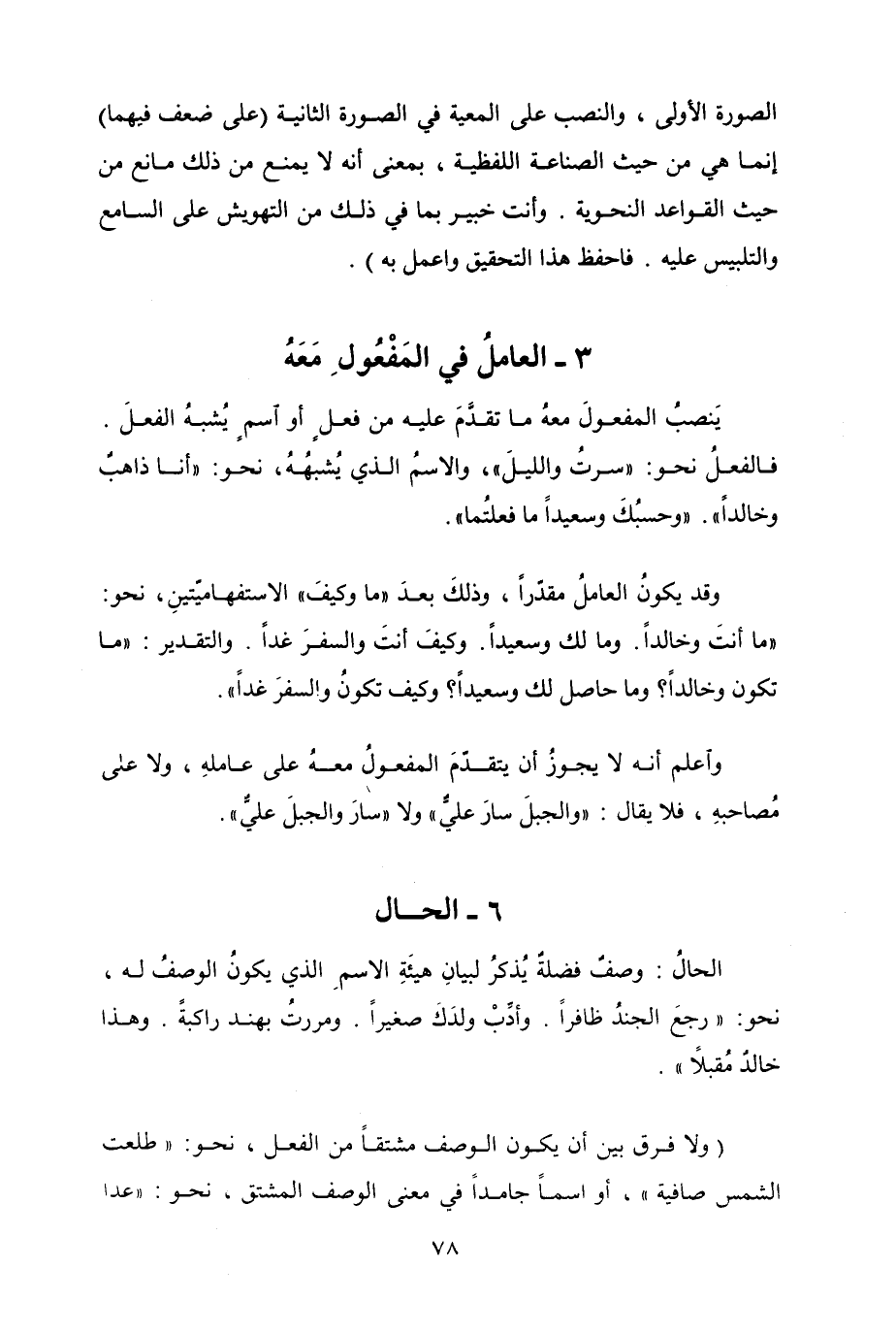 واعلم أنه لا يجوزُ أن يتقدّمَ المفعولُ معهُ على عاملهِ، ولا على مُصاحبهِ، فلا يقال "والجبلَ سارَ عليٌّ" ولا "سارَ والجبلَ عليٌّ".