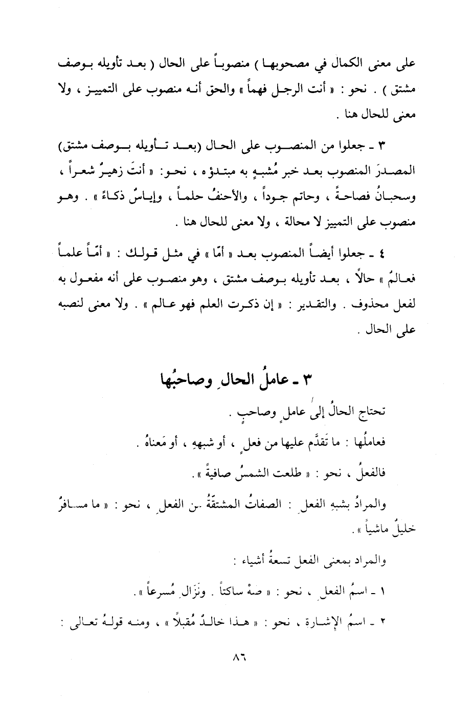 4- جعلوا أيضاً المنصوب بعد "أمّا" في مثل قولك "أمّا علماً فعالمٌ" حالاً، بعد تأويله بوصف مشتق، وهو منصوب على أنه مفعول به لفعل محذوف، والتقدير "أن ذكرت العلم فهو عالم". ولا معنى لنصبه على الحال.