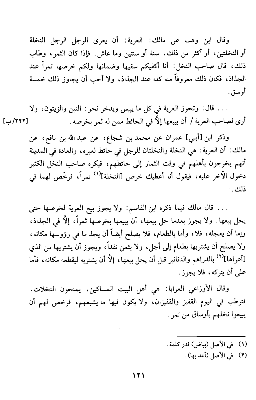 وَذكر ابْن أبي عمرَان عَن مُحَمَّد بن شُجَاع عَن عبد اللة بن نَافِع عَن مَالك أَن الْعرية هِيَ النَّخْلَة والنخلتان للرجل فِي حَائِط لغيرة وَالْعَادَة فِي الْمَدِينَة أَنهم يخرجُون بأهلهم فِي وَقت الثِّمَار إِلَى حائطهم فيكرة صَاحب النّخل الْكثير دُخُول الآخر علية فَيَقُول أَنا أُعْطِيك خرص النَّخْلَة تَمرا فَرخص لَهما فِي ذَلِك