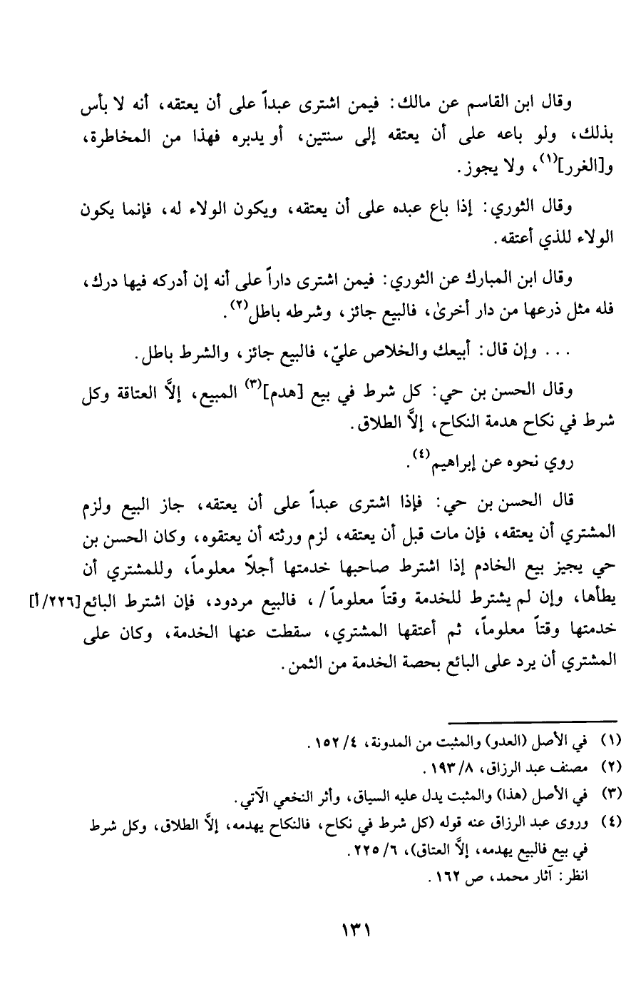 قَالَ الْحسن بن حَيّ فَإِذا اشْترى عبدا على أَن يعتقهُ جَازَ البيع وَلزِمَ المُشْتَرِي أَن يعتقهُ فَإِن مَاتَ قبل أَن يعتقهُ لزم ورثته أَن يعتقوه وَكَانَ الْحسن بن حَيّ يُجِيز بيع الْخَادِم إِذا اشْترط صَاحبهَا خدمتها أَََجَلًا مَعْلُوما وَللْمُشْتَرِي أَن يَطَأهَا وَإِن لم يشْتَرط للْخدمَة وقتا مَعْلُوما فَالْبيع مَرْدُود فَإِن اشْترط البَائِع خدمتها وقتا مَعْلُوما ثمَّ أعْتقهَا المُشْتَرِي سَقَطت عَنْهَا الْخدمَة وَكَانَ على المُشْتَرِي أَن يرد على البَائِع بِحِصَّة الْخدمَة من الثّمن