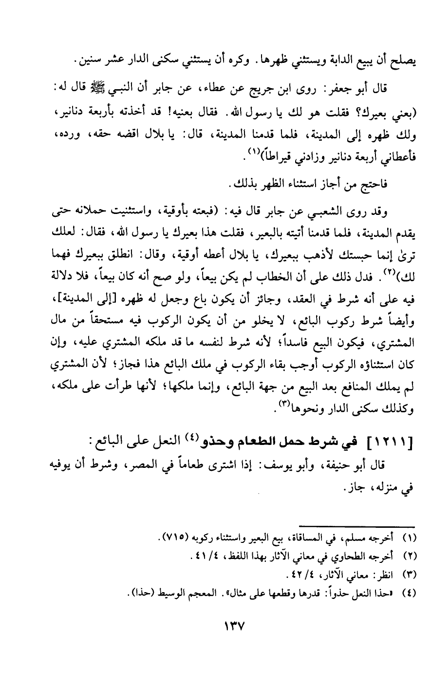 قَالَ أَبُو جَعْفَر روى ابْن جريج عَن عَطاء عَن جَابر أَن النَّبِي صلى الله عَلَيْهِ وَسلم قَالَ لَهُ بِعني بعيرك فَقلت هُوَ لَك يَا رَسُول الله فَقَالَ بِعَيْنِه قد أَخَذته بأَرْبعَة دَنَانِير وَلَك ظَهره إِلَى الْمَدِينَة فَلَمَّا قدمنَا الْمَدِينَة قَالَ يَا بِلَال اقضه حَقه ورده فَأَعْطَانِي أَرْبَعَة دَنَانِير وَزَادَنِي قيراطا