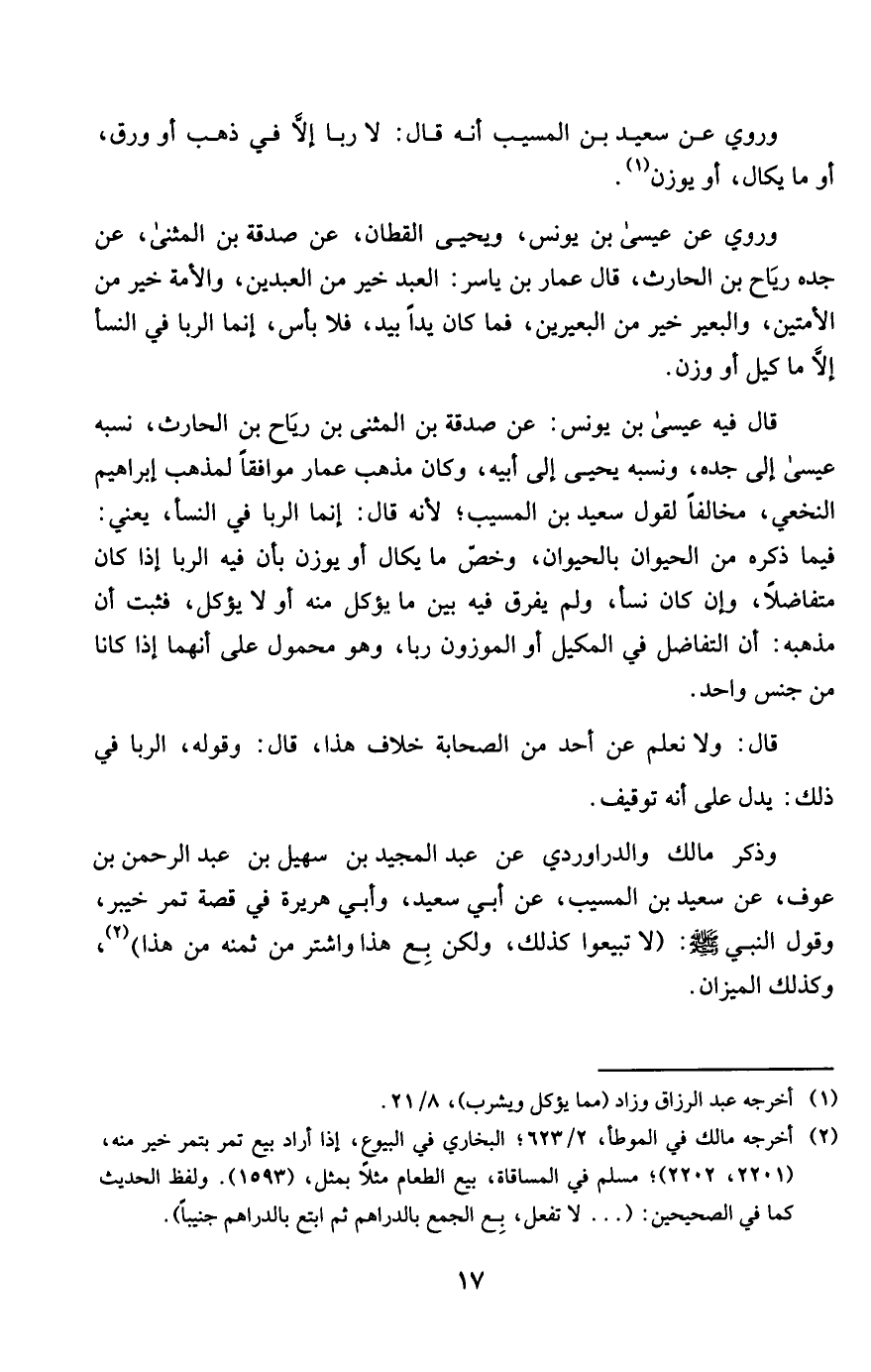 قَالَ فِيهِ عِيسَى بن يُونُس عَن صَدَقَة بن الْمثنى بن ريَاح بن الْحَارِث نِسْبَة عِيسَى إِلَى جده وَنسبه يحيى إِلَى أبيَّة وَكَانَ مَذْهَب عمار مواقفا لمَذْهَب إِبْرَاهِيم النَّخعِيّ مُخَالفا لقَوْل سعيد بن الْمسيب لِأَنَّهُ قَالَ إِنَّمَا الرِّبَا فِي النسأ يَعْنِي فِيمَا ذكره من الْحَيَوَان بِالْحَيَوَانِ وَخص مَا يُكَال أَو يُوزن بِأَن فِيهِ الرِّبَا إِذا كَانَ مُتَفَاضلا وَإِن كَانَ نسأ وَلم يفرق فِيهِ بَين مَا يُؤْكَل مِنْهُ أَو لَا يُؤْكَل فَثَبت أَن مذْهبه أَن التَّفَاضُل فِي الْمكيل أَو الْمَوْزُون رَبًّا وَهُوَ مَحْمُول على أَنَّهُمَا إِذا كَانَا من جنس وَاحِد