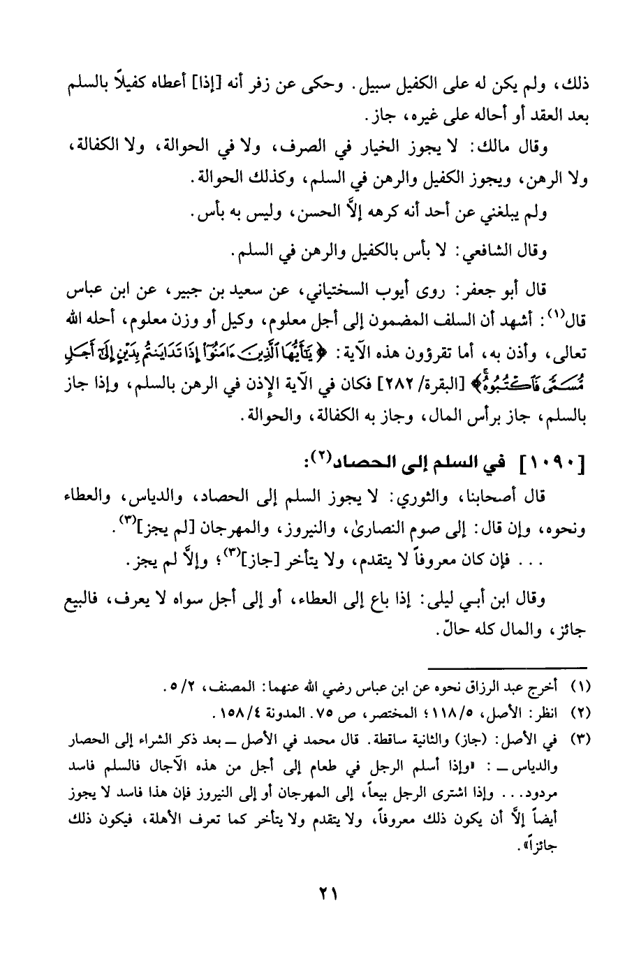 قَالَ أَبُو جَعْفَر روى أَيُّوب السّخْتِيَانِيّ عَن سعيد بن جُبَير عَن ابْن عَبَّاس قَالَ أشهد أَن السّلف الْمَضْمُون إِلَى اجل مَعْلُوم وَكيل أَو وزن مَعْلُوم أحله الله تَعَالَى وَأذن بِهِ أما تقرؤون هَذِه الْآيَة {يَا أَيهَا الَّذين آمنُوا إِذا تداينتم بدين إِلَى أجل مُسَمّى فاكتبوه} الْبَقَرَة 282 فَكَانَ فِي الْآيَة الْإِذْن فِي الرَّهْن بالسلم وَإِذا جَازَ بالسلم جَازَ بِرَأْس المَال وَجَاز بِهِ الْكفَالَة وَالْحوالَة