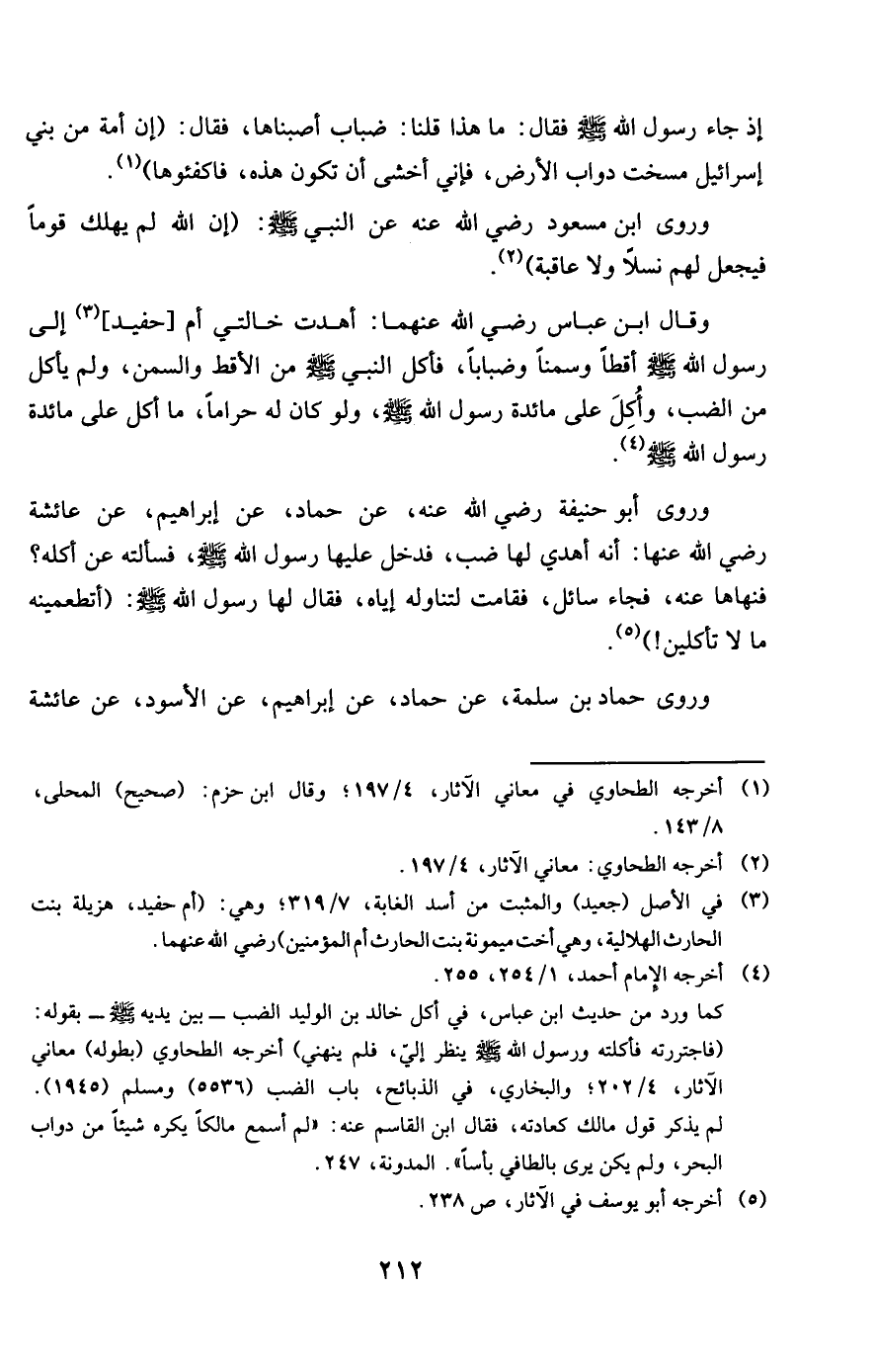 وروى أَبُو حنيفَة رَضِي الله عَنهُ عَن حَمَّاد عَن إِبْرَاهِيم عَن عَائِشَة رَضِي الله عَنْهَا أَنه أهدي لَهَا ضَب فَدخل عَلَيْهَا رَسُول الله صلى الله عَلَيْهِ وَسلم فَسَأَلته عَن أكله فَنَهَاهَا عَنهُ فجَاء سَائل فَقَامَتْ لتنَاوله إِيَّاه فَقَالَ لَهَا رَسُول الله صلى الله عَلَيْهِ وَسلم أتطعمينه مَا لَا تأكلين