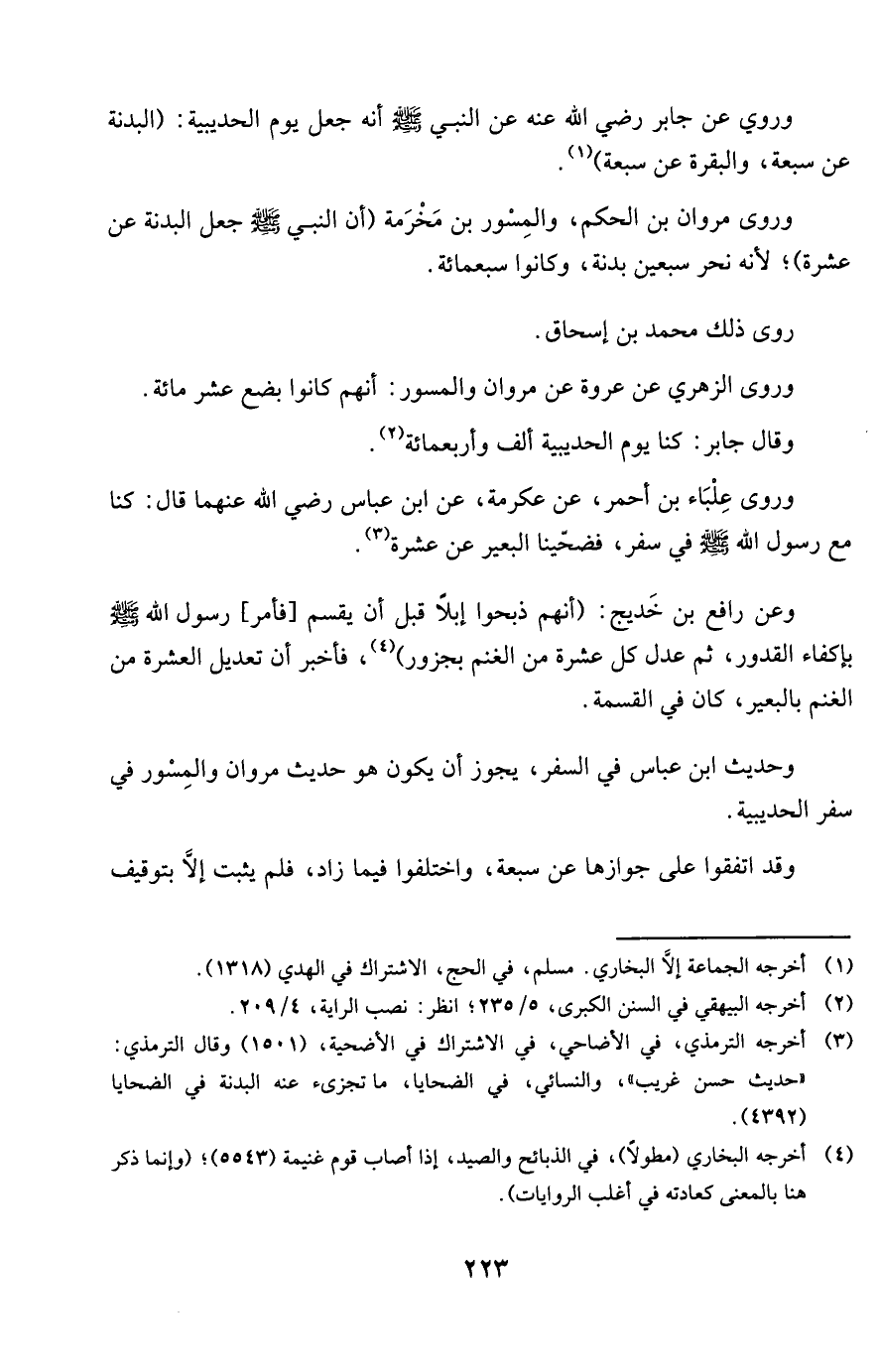 وروى مَرْوَان بن الحكم والمسور بن مخرمَة أَن النَّبِي صلى الله عَلَيْهِ وَسلم جعل الْبَدنَة عَن عشرَة لِأَنَّهُ نحر سبعين بَدَنَة وَكَانُوا سَبْعمِائة