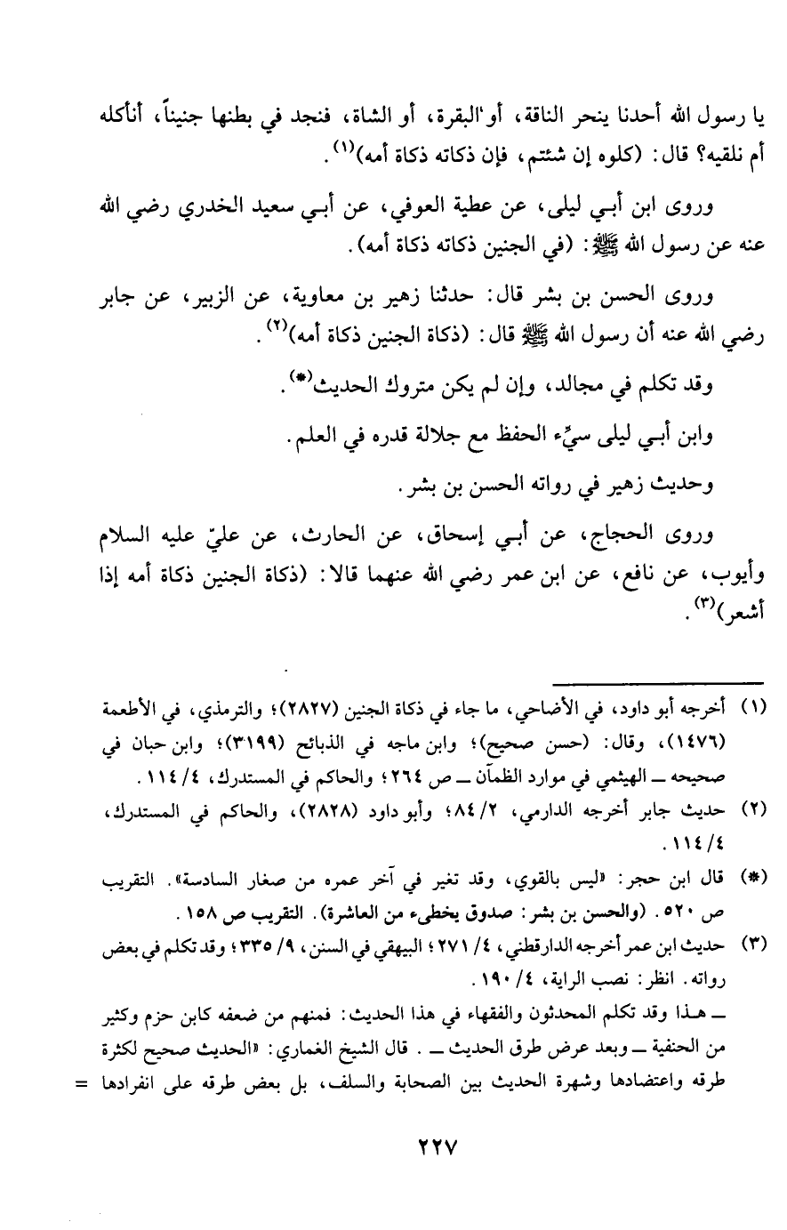وروى ابْن أبي ليلى عَن عَطِيَّة الْعَوْفِيّ عَن أبي سعيد الْخُدْرِيّ رَضِي الله عَنهُ عَن رَسُول الله صلى الله عَلَيْهِ وَسلم فِي الْجَنِين ذَكَاته ذَكَاة أمه