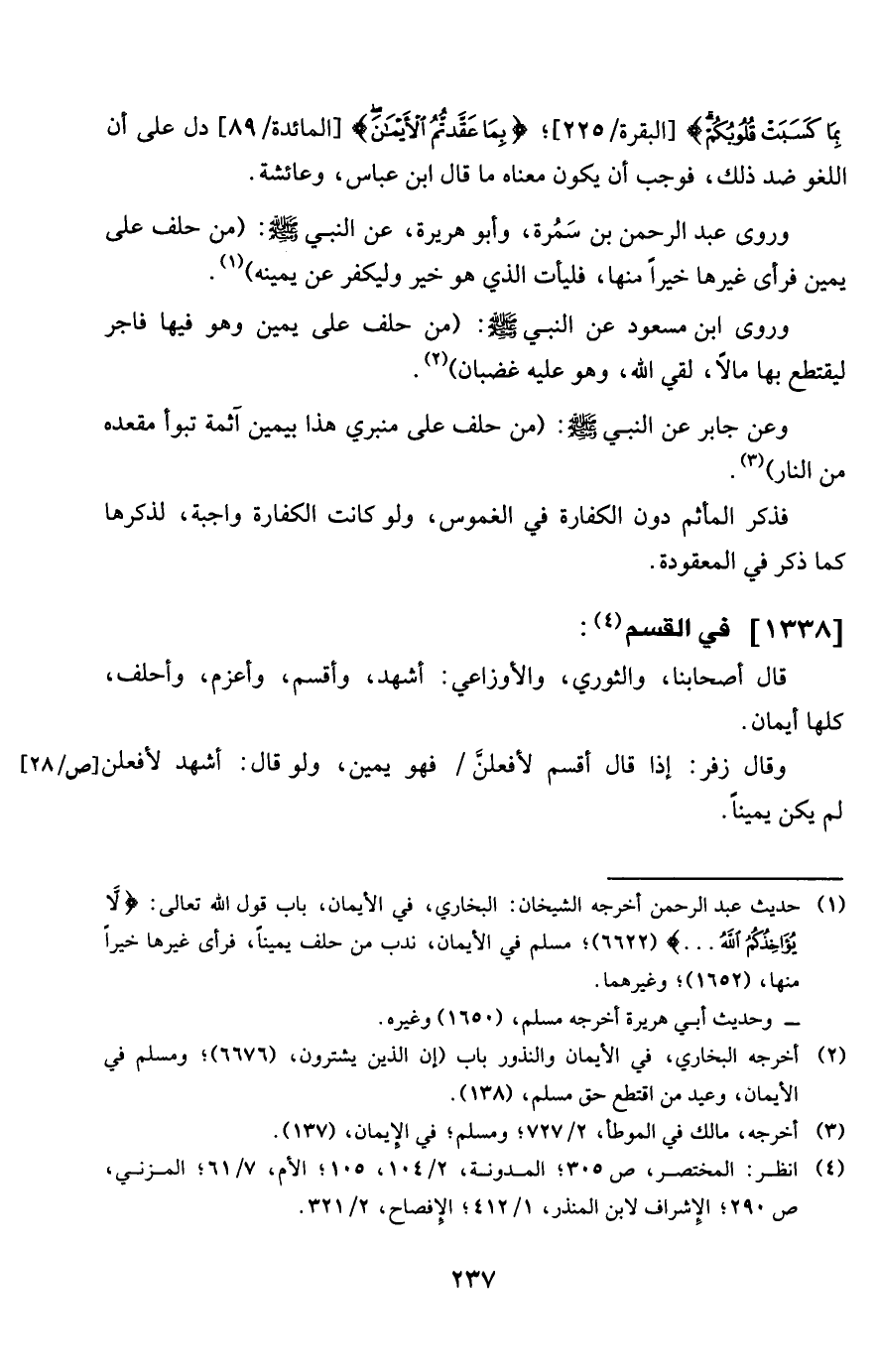 وروى ابْن مَسْعُود عَن النَّبِي صلى الله عَلَيْهِ وَسلم من حلف على يَمِين وَهُوَ فِيهَا فَاجر ليقتطع بهَا مَالا لَقِي الله وَهُوَ عَلَيْهِ غَضْبَان