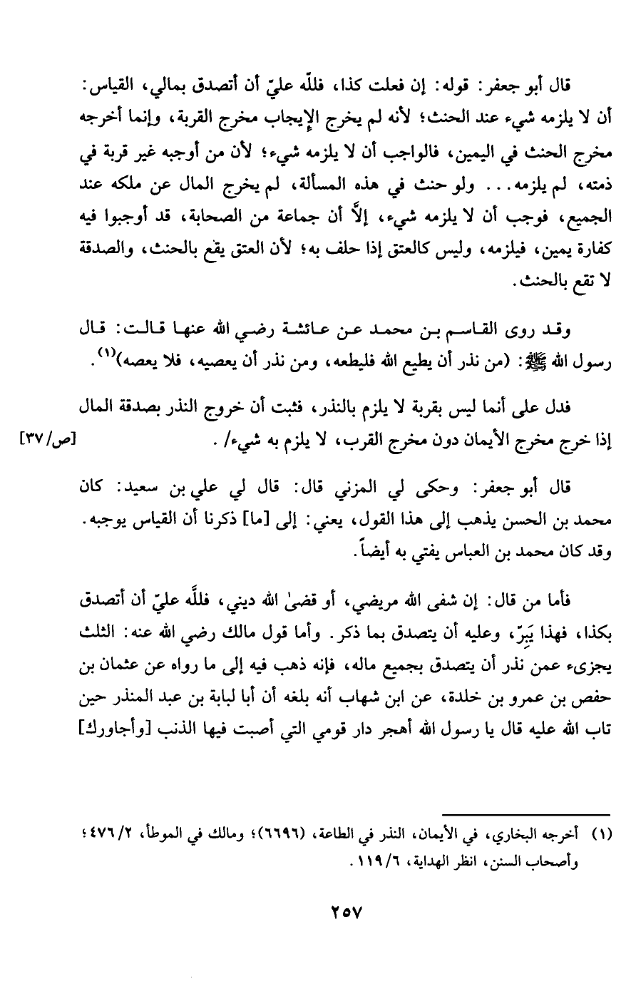 فَدلَّ على أَنما لَيْسَ بقربة لَا يلْزم بِالنذرِ فئبت أَن خُرُوج النّذر بِصَدقَة المَال إِذا خرج مخرج الْأَيْمَان دون مخرج الْقرب لَا يلْزم بِهِ شَيْء